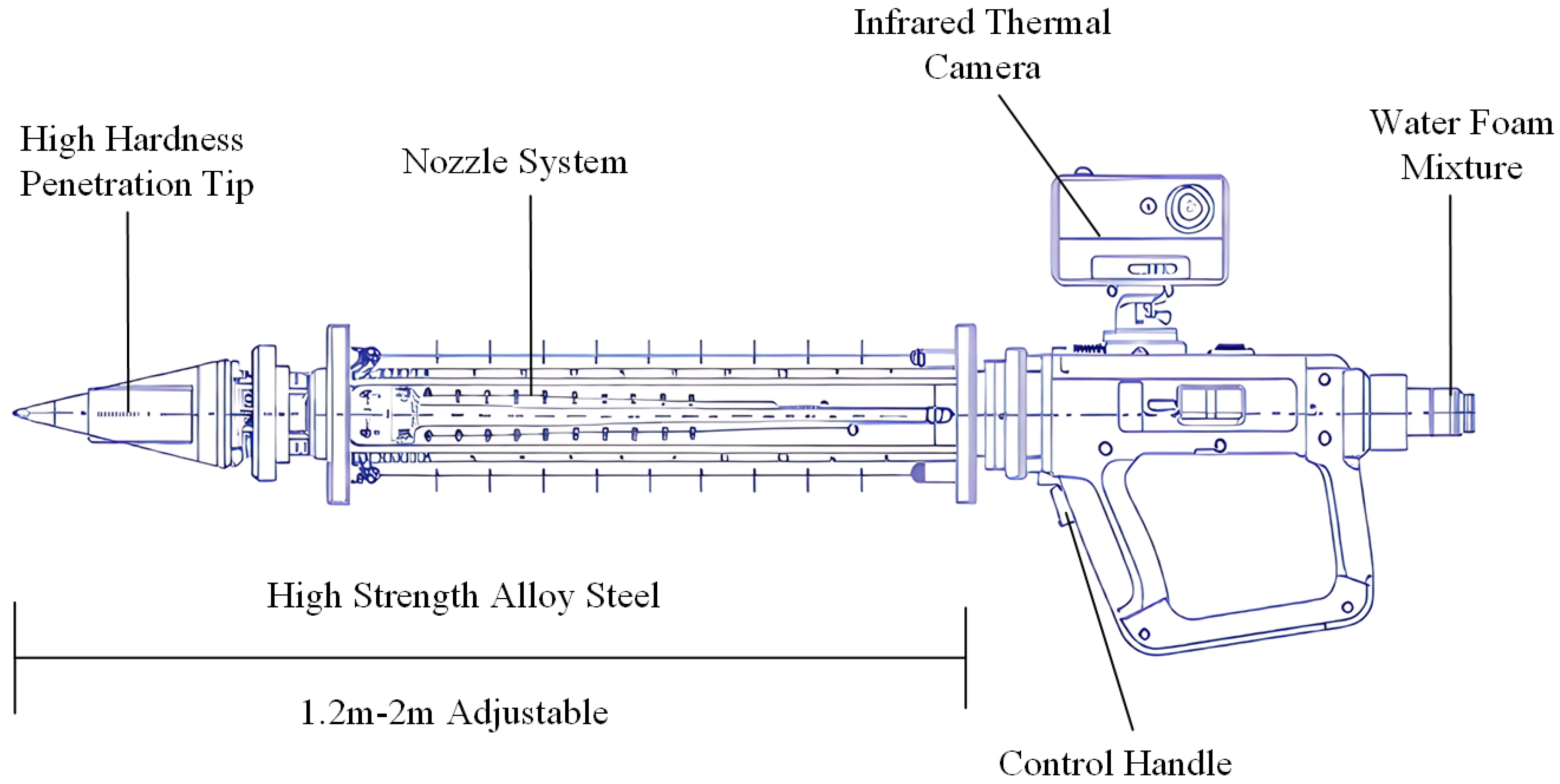 Against this backdrop, there is an urgent need for a portable, low-cost, and rapidly deployable directional penetrating fire-suppression device to bridge the time gap between onboard suppression and ground-based intervention. After the crew evacuation is confirmed, the device enables thermal imaging–based hotspot localization, followed by mechanical penetration to deliver extinguishing agents directly into the cargo compartment, forming a rapid “arrival–localization–penetration–suppression” operational loop. The purpose of this device is not to replace large-scale firefighting systems but to serve as a tiered tactical supplement, providing a time-efficient and low-risk solution for ground rescue operations.