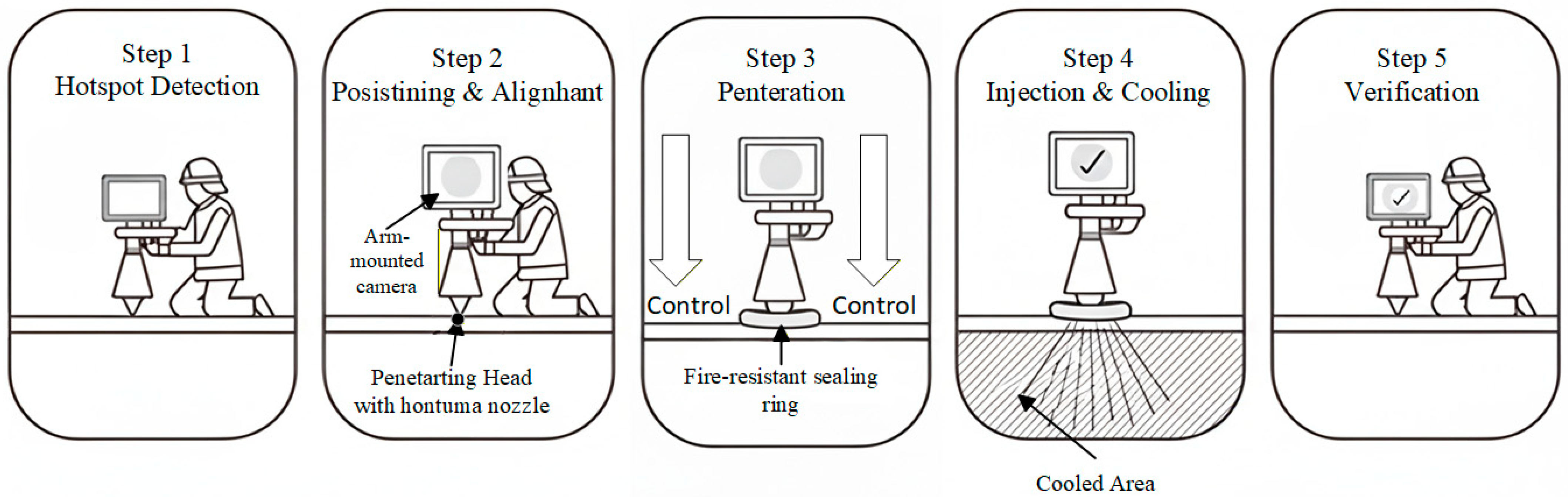 Figure 8, the operational procedure of the portable penetrating fire-suppression device consists of five sequential steps. First, an infrared thermal imager is used to scan the cabin floor and locate heat spots. Second, the penetrating device is positioned and aligned precisely with the identified source. Third, the driving mechanism is activated to perform penetration, followed by insertion of the spray pipe to achieve a sealed connection. Finally, the extinguishing agent supply system is connected, and directional discharge is initiated. The entire process can be completed by a single operator within approximately one minute. To ensure operational safety, the probe structure has been mechanically optimized to prevent damage to load-bearing components, while the sealing ring effectively prevents agent leakage and backflow of hot gases. The extinguishing agent selection follows electrical compatibility and non-corrosive principles. This device is applicable to various aircraft types and airport conditions, providing an efficient and practical tactical supplement for rapid, targeted fire suppression on the ground.