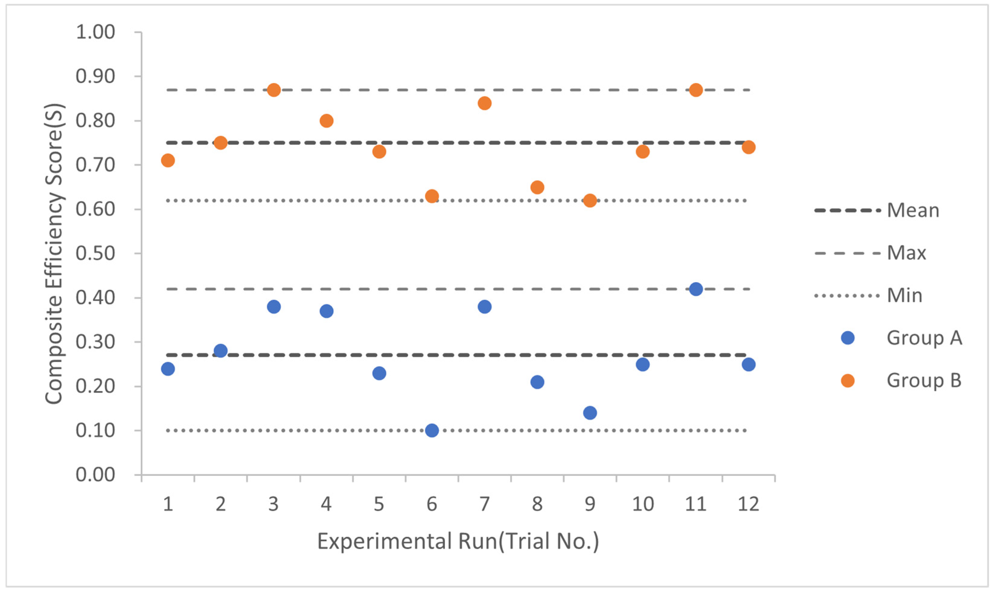 score. The raw records show that both methods exhibited some variability under comparable conditions; however, the overall trend indicates that Group B consistently achieved shorter times for time-based indicators and higher values for efficiency-based indicators.