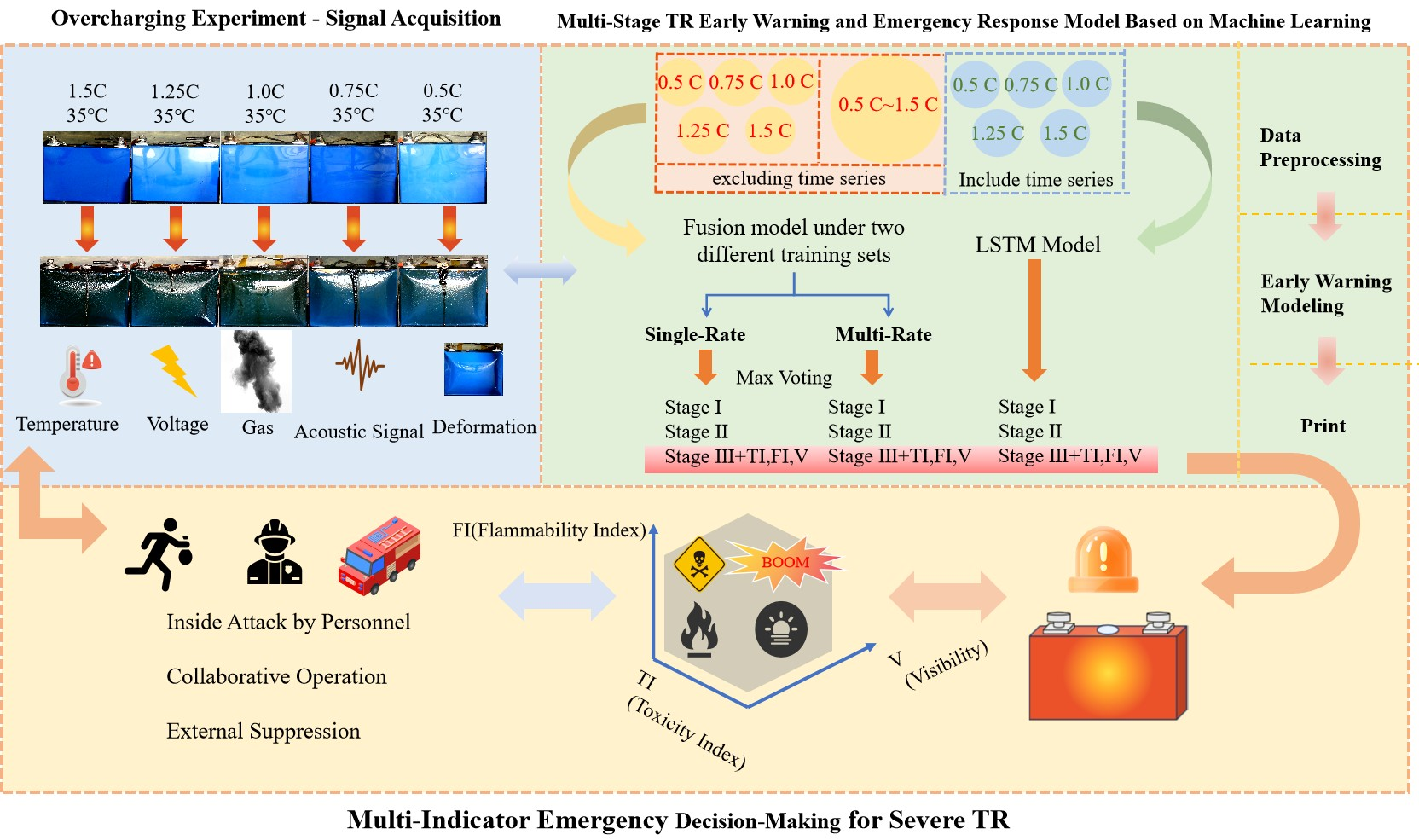Although the aforementioned studies have laid a solid foundation for understanding the mechanisms of TR and for developing early warning methods, several challenges remain in the context of systematic research tailored to real-world engineering applications: (1) Existing early warning methods often rely on single-modal signals, leading to poor robustness under complex operating conditions and a lack of feature redundancy design. (2) For the overcharge-to-thermal-runaway process, intervention and processing at different time points may lead to varying types of damage and risks. Current approaches to precise early warning and real-time monitoring primarily focus on identifying critical points during the TR phase, with limited attention to the early stages of overcharging, where accurate forecasting is still lacking. (3) Once TR enters the irreversible stage, the high-concentration release of toxic gases such as CO and HF will significantly threaten the safety of personnel, and the visibility will drop sharply to below 0.5m due to smoke obstruction. For assessing such hazardous scenarios, traditional manual interpretation-based responses are evidently incompatible with the characteristics of lithium battery fires—namely, rapid onset and difficulty to extinguish. The traditional manual judgment and conventional response process fail to match the characteristics of battery fires, which are high temperature, high toxicity, and rapid development, and lack real-time data to assist subsequent emergency command and decision-making
