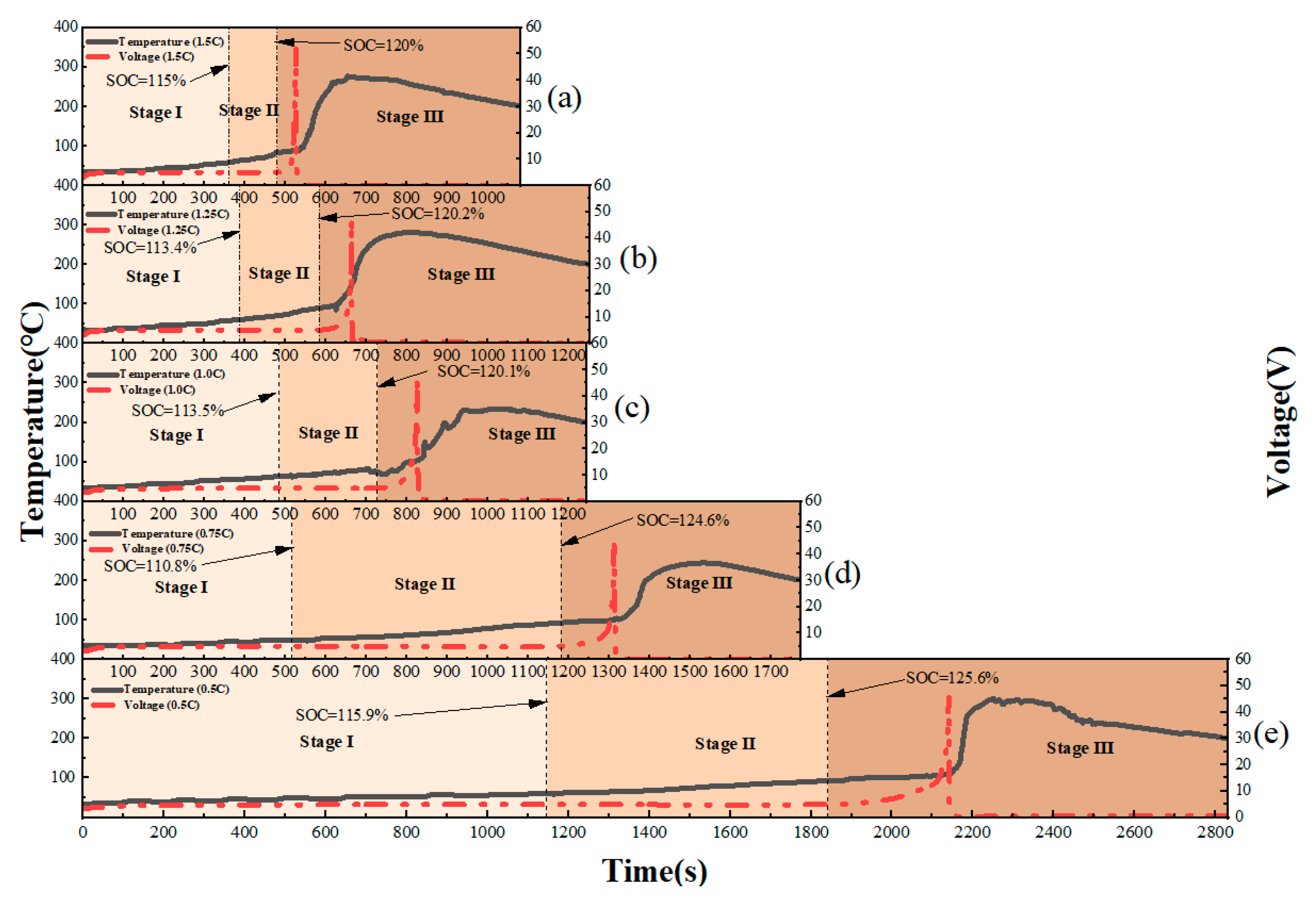 1. A three-stage TR evolution model was constructed based on C-rate conditions. By integrating experimental results, the process was clearly divided into Stage I (from the onset of overcharging to the activation of the safety valve), Stage II (from safety valve activation to voltage rebound) and Stage III (from sharp fluctuations in voltage and temperature to thermal stabilization). This provides a structured framework for stage-specific signal identification and mechanisti analysis throughout the entire TR process.