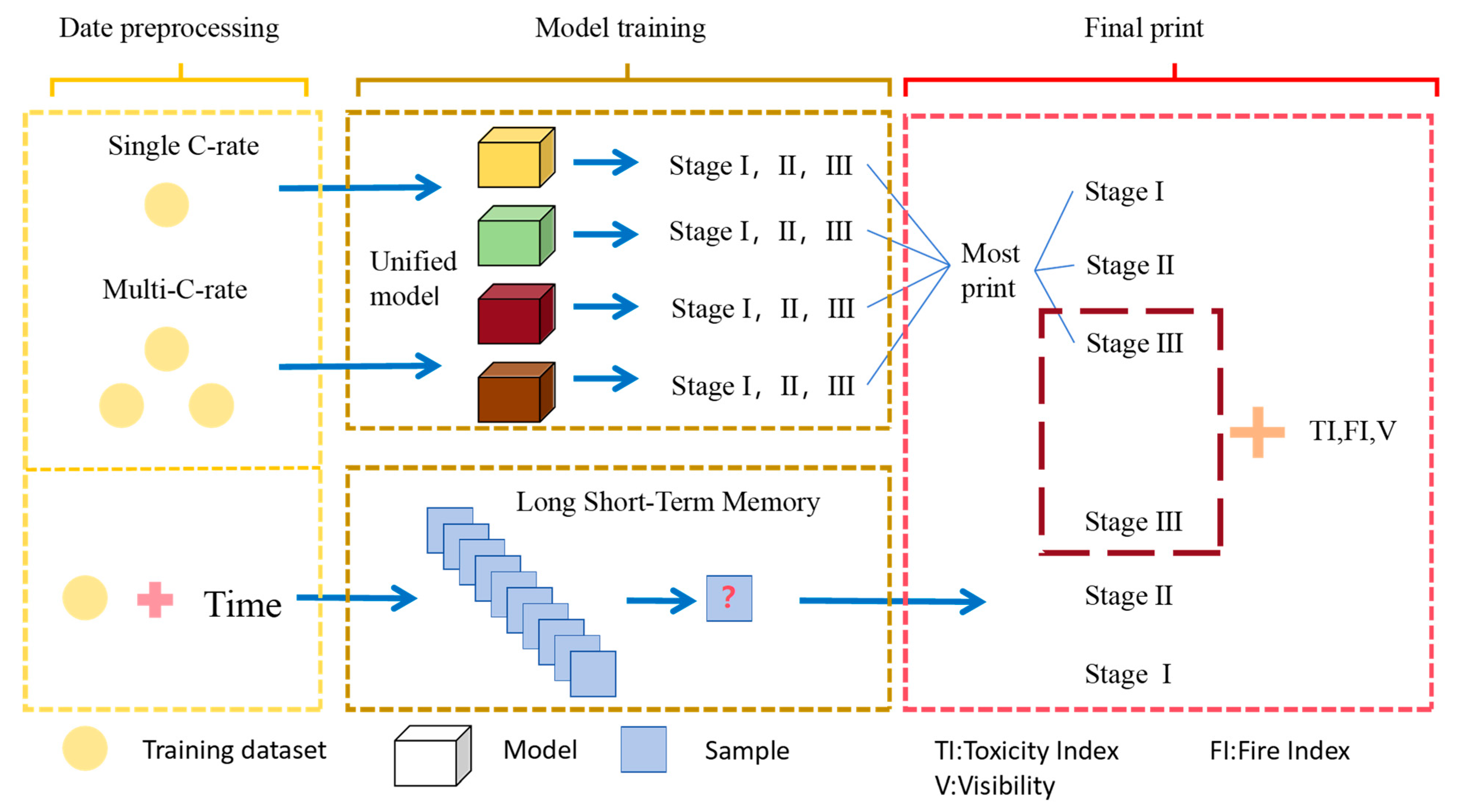 Leveraging the staged TR model and multimodal data, we build a fusion early warning model based on traditional machine learning and an LSTM model based on deep learning. A multi-level TR state recognition network was constructed to enable automatic stage classification and precise early warning throughout the entire TR process. At the same time, for high-risk emergency scenarios following severe TR in Stage III, we propose a Multi-Dimensional Dynamic Emergency Decision Matrix. This framework integrates key parameters, including Toxicity Index (TI), Flammability Index (FI) and smoke visibility into the response framework to support the tiered formulation of rescue strategies and improve the accuracy, safety and intelligence of emergency management during critical incidents.