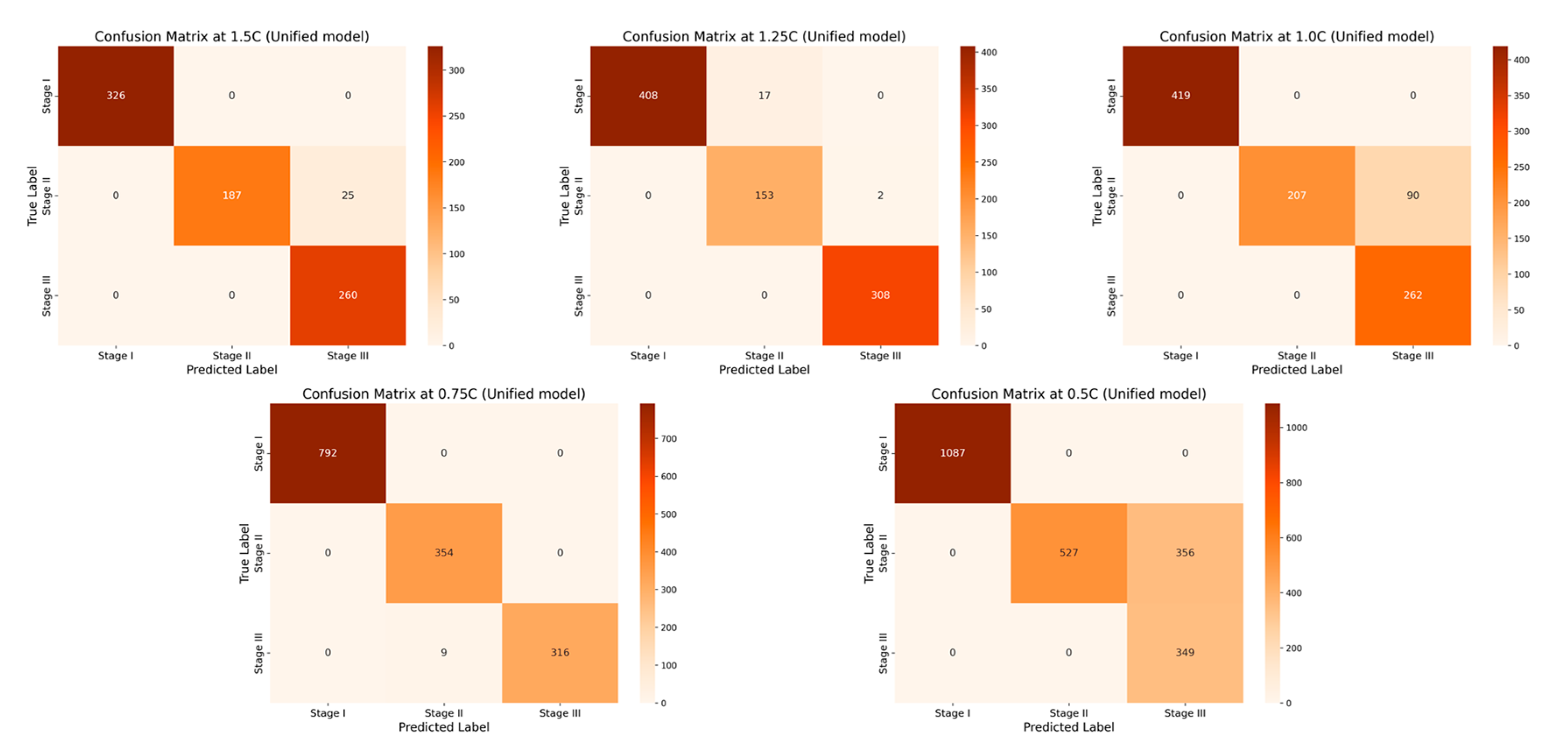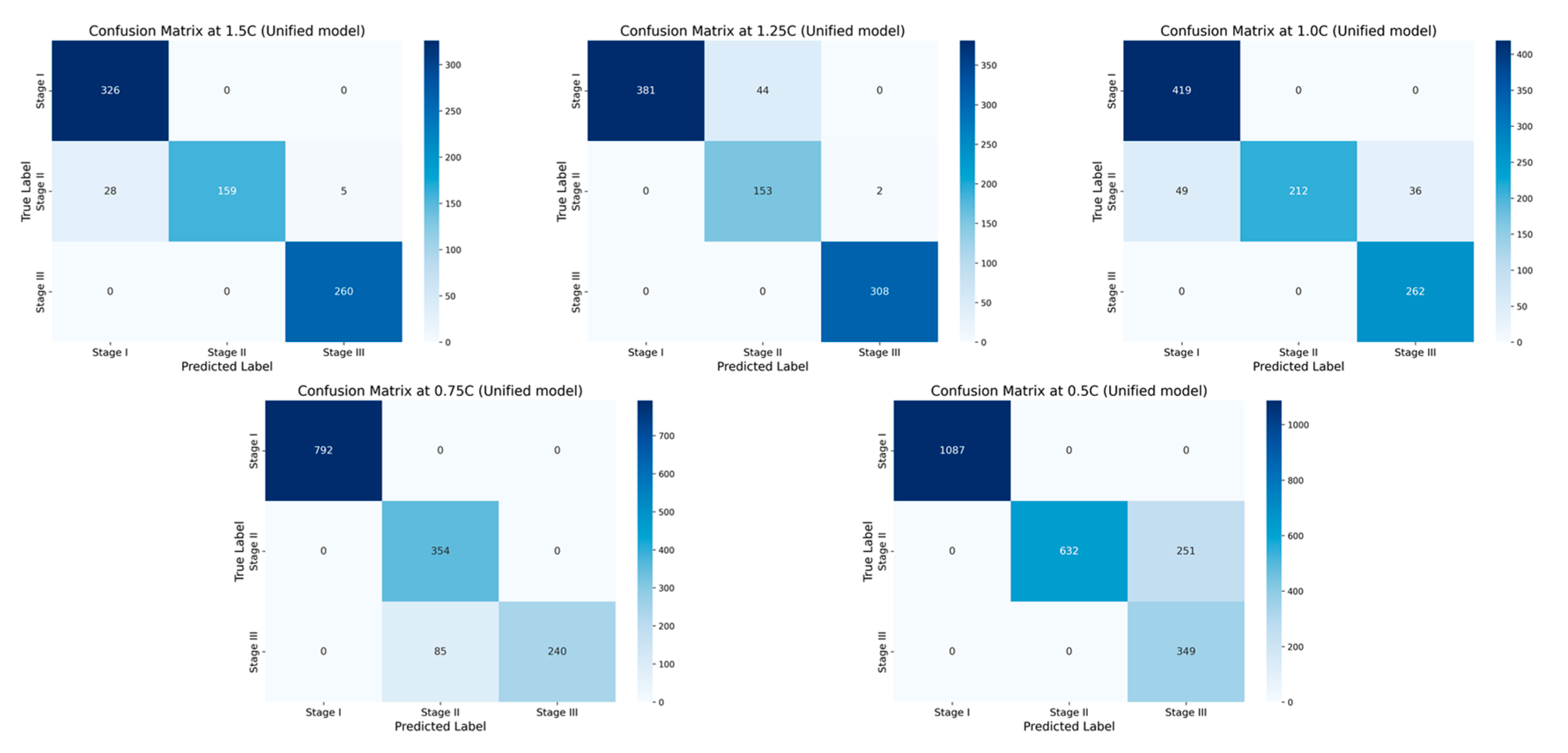 4. LSTM was introduced for time-series modeling. This approach addresses the limitations of traditional models in capturing continuous signal dynamics. The model achieves over 95% accuracy across various C-rates, making it suitable for real-time continuous monitoring and early warning deployment. At the same time, the high generalization ability and computational efficiency of the fusion model (especially the multi-rate) complement LSTM’s superior temporal precision and early warning potential.