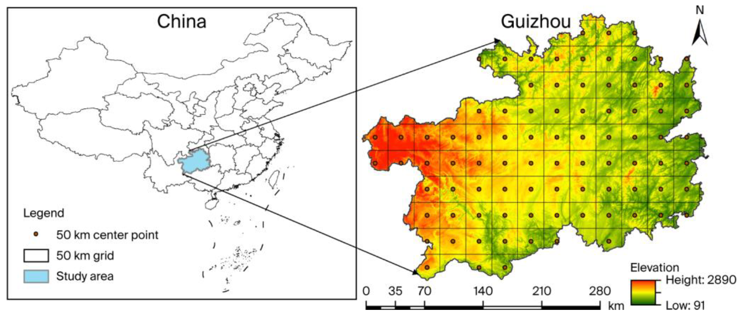 Computing forest fire occurrence probabilities requires sufficient sample sizes. Treating Guizhou Province as a single unit would yield inadequate samples while obscuring the spatial heterogeneity in the meteorological and topographic conditions, compromising the reliability of fuel moisture content and spread component calculations. To enhance the data fidelity, the study area was partitioned into subregions, with central-point meteorological and topographic values representing each unit. Aligned with Article 15 of China’s Regulations on Forest Fire Prevention, mandating county-based forest fire danger zoning, and considering Guizhou’s 176,167 km
