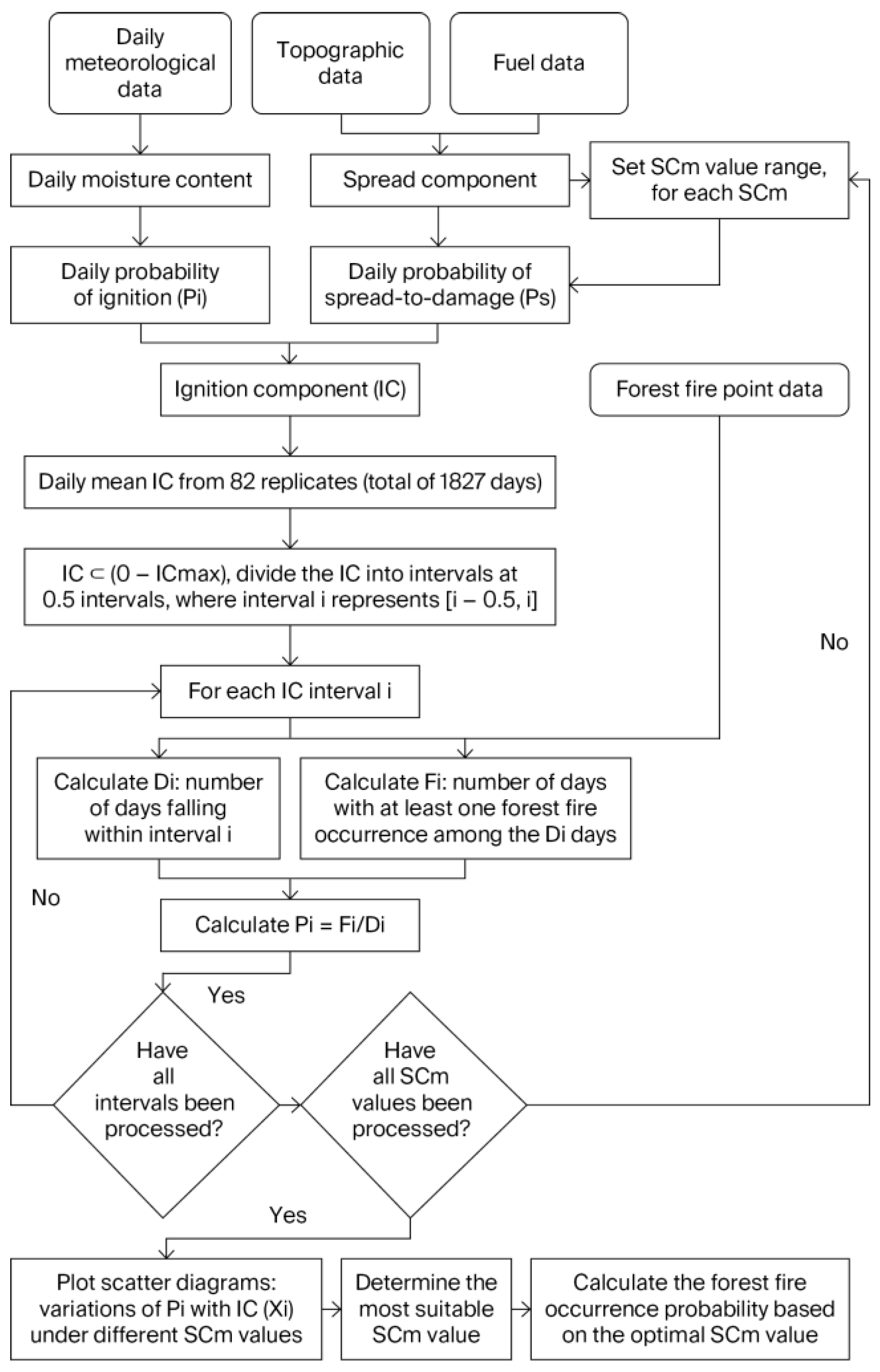 SCm value for the study area was identified. Subsequent calculations of the forest fire occurrence probability and further analyses within this study were then conducted based on this determined