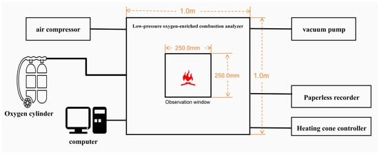 Low-pressure oxygen-enriched combustion tests were conducted using an analyzer (model: jd-6004, Dongguan Jiedong Test Equipment Co., Ltd., located in Dongguan, China). The experiments were performed in Guanghan, Sichuan, China, where the local atmospheric pressure was approximately 95 kPa. The overall structure of the analyzer is illustrated in Figure 2. The system realizes an accurate altitude environment simulation through the integrated pressure control module, and the simulation range can reach 10–100 kPa. The size of the main combustion chamber was 1 m × 1 m × 1 m, which was integrally cast from a high-temperature alloy. The front wall was integrated with a quartz glass observation window with a size of 250 mm × 250 mm, which was convenient for observing the combustion phenomenon during the experiment. Fifteen air inlets were evenly distributed across three sides of the bottom plate of the cabin. These inlets were connected to an external oxygen supply, which was regulated using a precision pressure valve to establish a uniform gas composition and stable flow field within the cabin. Simultaneously, the air compressor and vacuum pump work together and are connected to the combustion chamber through a pipeline system to jointly maintain the dynamic balance of the pressure in the chamber. All electrical signal wires were airtight and connected through the preset cabin interface (using a silicone rubber sealing plug) to ensure that the entire system could maintain a stable and reliable operating state under reduced-pressure environment.