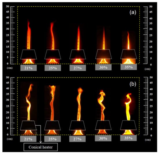 As an important parameter for exploring fire risk, the flame shape can reflect the combustion state and development direction of the fire in real time, which is crucial for reducing casualties and economic losses. The entire process of WPCs from ignition to extinction was recorded using a high-speed camera. As depicted in Figure 7, both the flame height and width decreased as the oxygen concentration increased, and the maximum flame height also decreased with increasing oxygen concentration.