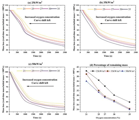 Figure 9d shows that the higher the heat flux and oxygen concentration, the lower the residual mass percentage. With an increase in heat flux, the radiation energy received by the material surface increased significantly, which accelerated the pyrolysis process and promoted the rapid release of volatile matter. Simultaneously, the increase in oxygen concentration enhanced the gas-phase combustion reaction intensity and caused the volatiles to oxidize and burn more completely, both of which led to the aggravation of material mass loss. In addition, when the oxygen concentration exceeded 25%, the three attenuation curves exhibited a convergence trend and almost coincided at heat fluxes of 35 and 50 kW/m2. This may be because, in a high-oxygen environment, the combustion reaction changes from oxygen diffusion control to pyrolysis kinetics control, and the pyrolysis rate of the material becomes the dominant factor. When the heat flux reached the critical value, the rapid formation of the surface carbonization layer blocked the further penetration of heat, resulting in the pyrolysis process not being significantly accelerated at higher heat flux (50 kW/m2), thus showing a similar mass loss behavior.
