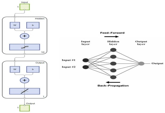 Each neuron in the hidden layer transforms its inputs by applying a nonlinear activation function, commonly a sigmoid or hyperbolic tangent, to a weighted sum of the inputs, as illustrated in Equation (5) [].