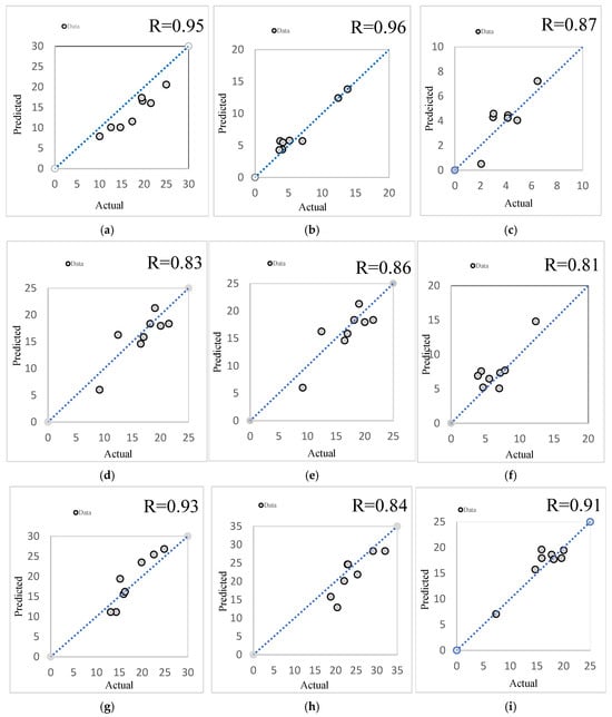 - Correlation Coefficient (R-value): To measure the strength of the relationship between the predicted and observed values. The Pearson correlation coefficient R is calculated as shown in Equation (9):
