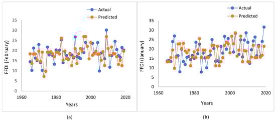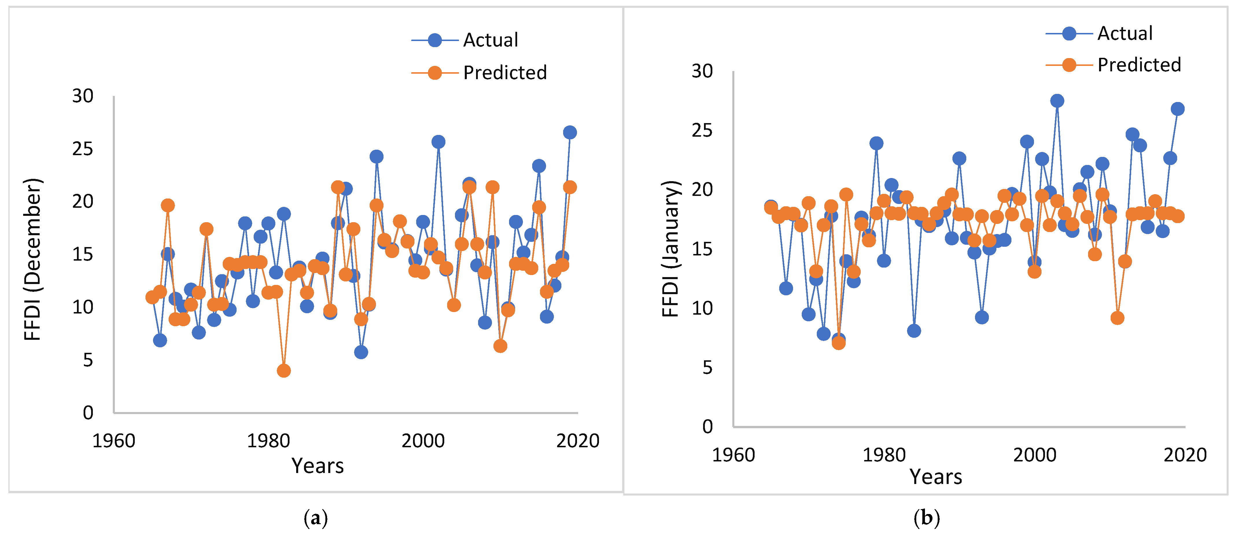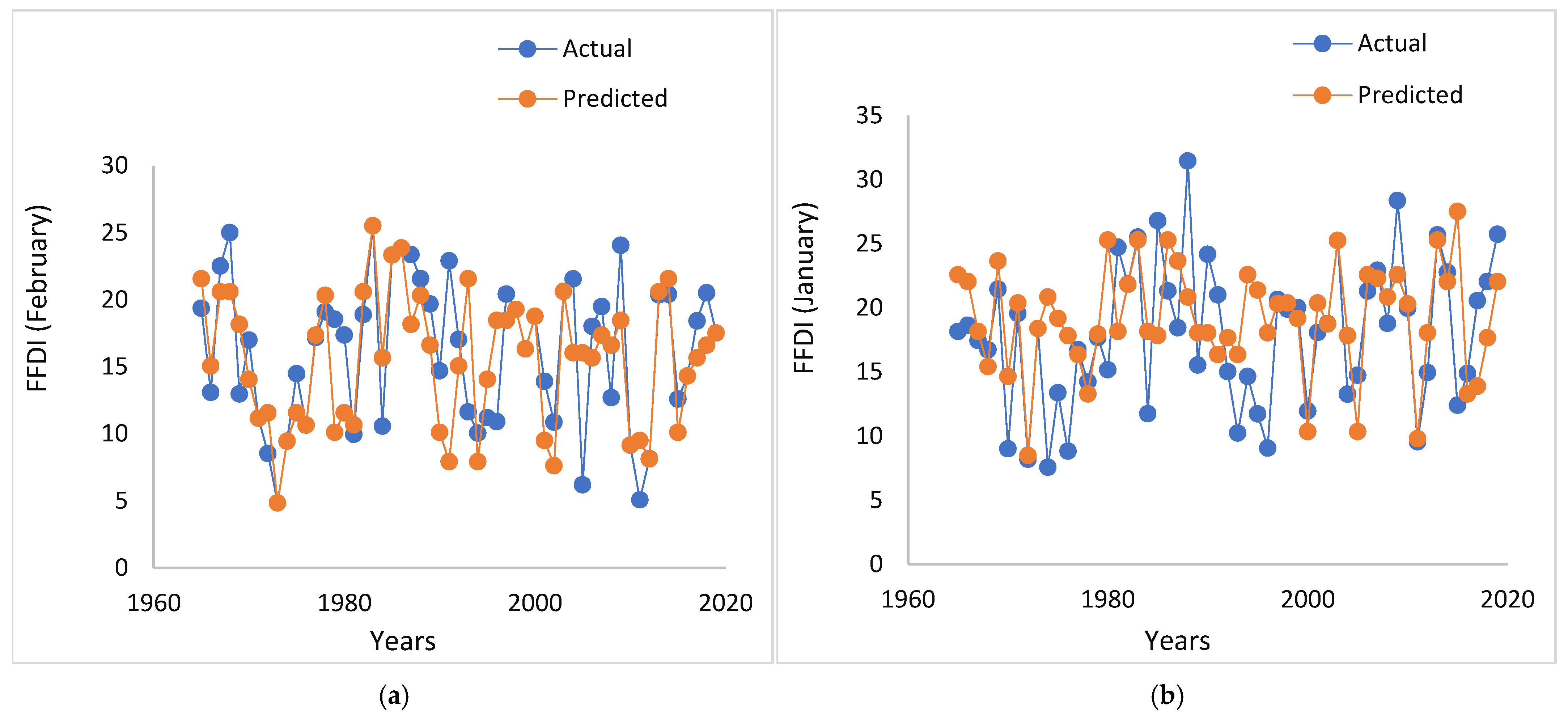 Table 4 summarises the Pearson correlation coefficients (R) between the two-month lagged SOI values and the FFDI values for the selected stations across southeastern Australia. Examining these lagged relationships provides insight into the extent to which SOI anomalies influence fire danger conditions in the following months. The results show clear spatial and temporal differences in correlation strength. The SOI values for October, November and December were analysed to capture their influence on the FFDI two-month-ahead prediction. Among the relationships, Albury showed the highest correlation (R = 0.95) for the October SOI value predicting the December FFDI value. Also, for predicting the January FFDI values, the correlation coefficient with the November SOI values is 0.86. The second-highest correlation (R = 0.94) was observed at Cape Otway for the November SOI value predicting the January FFDI value. For this station, the average correlation value for predicting FFDI values for all three months (December, January, and February) with the SOI values of the earlier months was 0.87. The third-highest correlated station was Bairnsdale, where a correlation coefficient of 0.91 was observed for the October SOI value predicting the December FFDI value. For this station, the average correlation value for predicting the FFDI values for all three months (December, January, and February) with the SOI values of the earlier months was 0.84. In general, the achieved correlation values for the two-month lag models were inferior to the achieved correlation values for the one-month lagged models; the correlation values achieved for one-month lagged models varied from 0.71 to 0.96 (average 0.83), whereas the correlation values achieved for two-month lagged models varied from 0.71 to 0.95 (average 0.81). Such outcomes from the models are reasonable, as the influences of the climate indices (SOI in this instance) are likely to become weaker with longer lag periods.