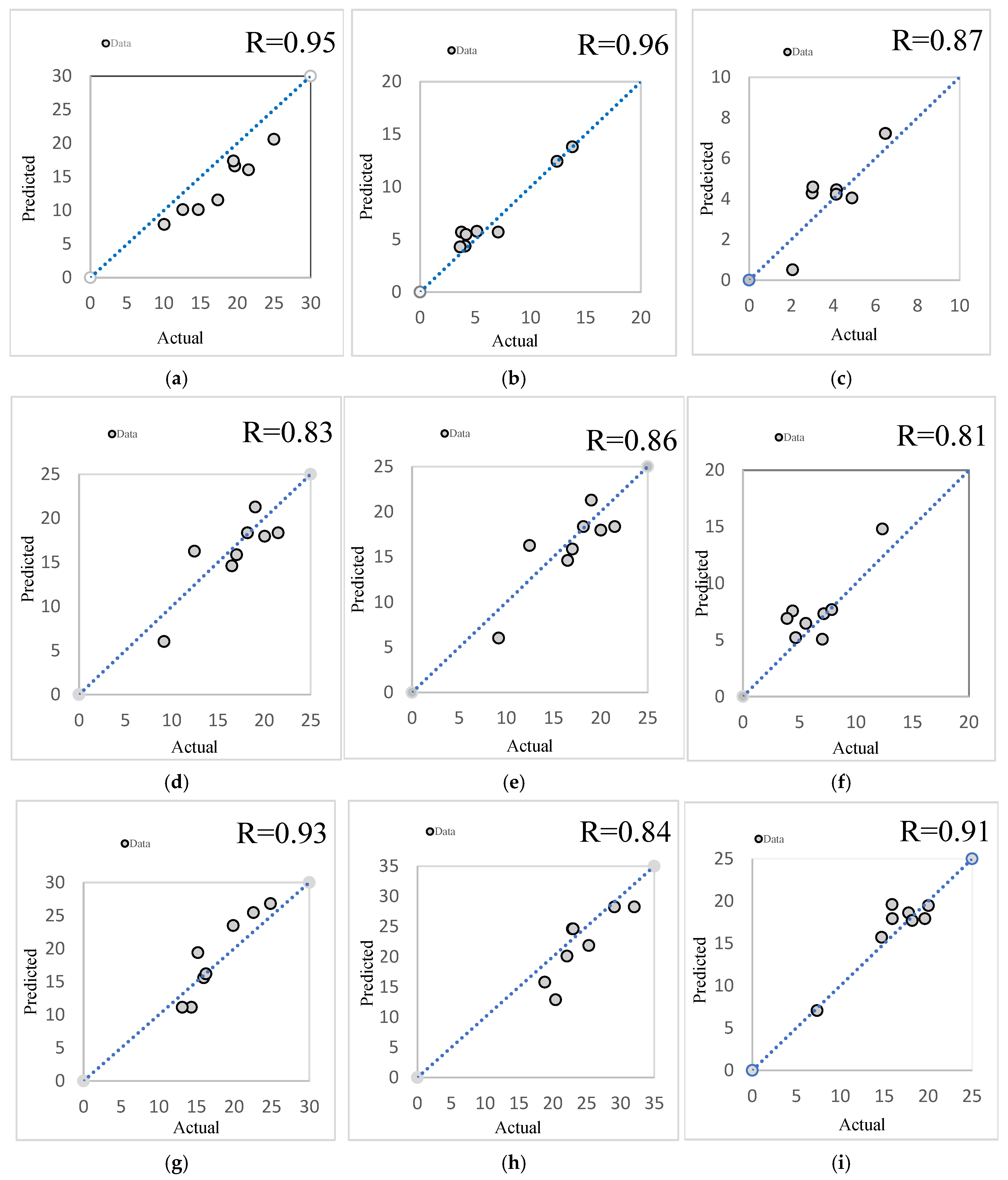 Figure 3 shows the scatter plots of the actual versus predicted FFDI values for the testing periods. To avoid the volume of graphs, the comparisons are shown for a few selected stations and selected lag periods. Figures also show the ideal (i.e., 45