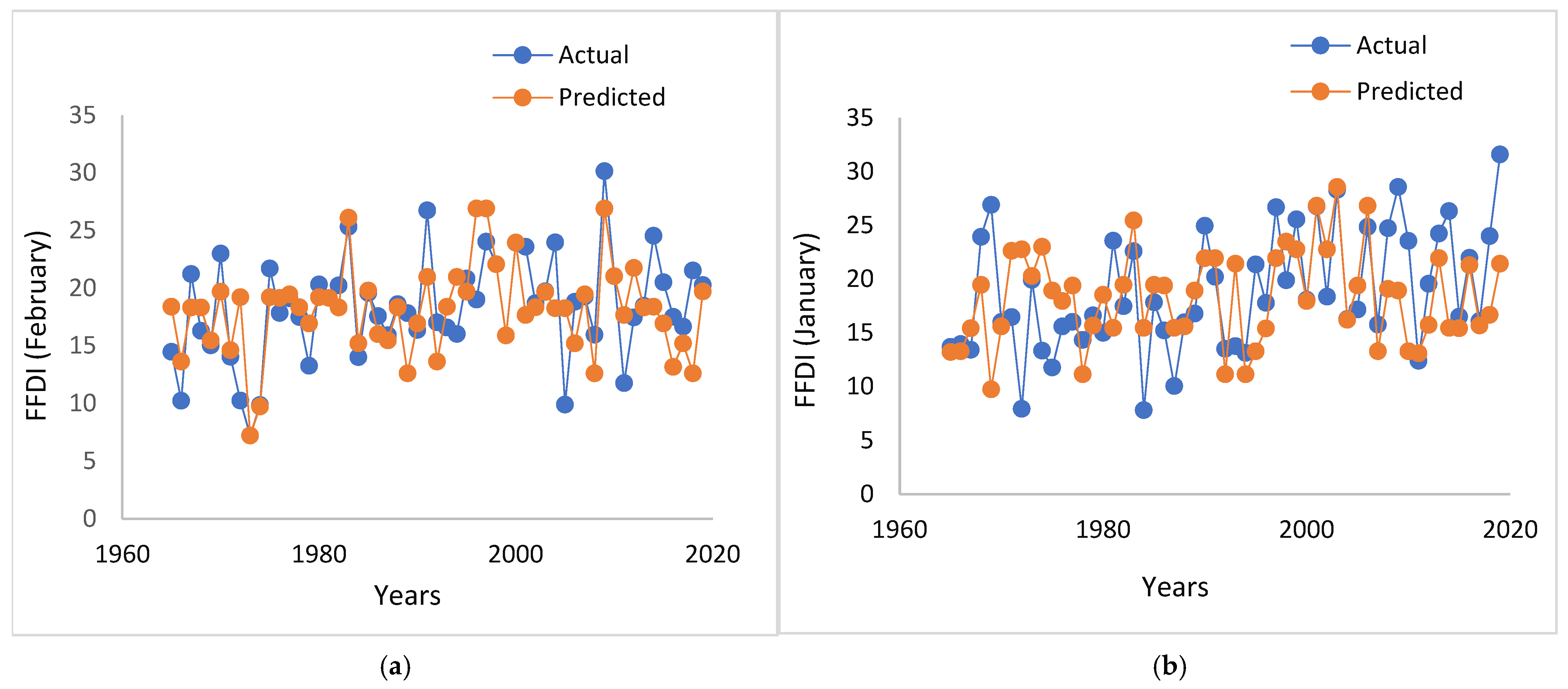 Figure 6 present the time series plots showing comparisons of the predicted and actual FFDI values for the whole simulation period. For demonstration, one station was selected from each region.