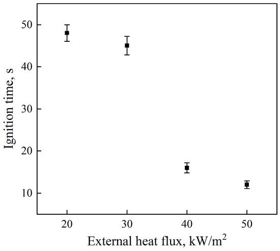 The FPUF used in this study was manufactured by Hangmei Sponge Co. (Hangzhou, China), with a density of 23.5 kg/m3 and an average heat value of approximately 24 kJ/g. Elemental analysis of the FPUF, conducted using a PerkinElmer 2400 analyzer (Elementar Analysensysteme GmbH, Langenselbold, Germany), is summarized in Table 1. The ignition characteristics of the FPUF were measured using a cone calorimeter. As shown in Figure 1, the ignition time decreased significantly as the external heat flux increased from 20 to 50 kW/m2, which confirmed the high flammability of the FPUF. To further explore how fuel size affects melt dripping behavior, four different sample dimensions were selected: ① 100 × 100 × 50 mm; ② 100 × 100 × 25 mm; ③ 200 × 200 × 50 mm; and ④ 200 × 200 × 25 mm (length × width × height).