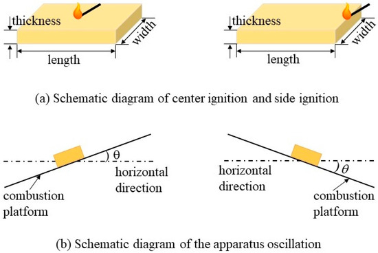 Prior to each test, the platform was leveled, and control parameters were set according to the target amplitude and frequency. The exhaust fan was activated, and the sample was placed at the center of the wire-mesh combustion platform with its four corners fixed using iron wires. Ignition was achieved using a flame igniter, simultaneously with the activation of the oscillation mechanism. As shown in Figure 3a, center ignition was performed at the center of the FPUF sample’s upper surface, while side ignition was performed at the midpoint along one edge of the FPUF sample. During oscillation, the combustion platform and the upper platform tilt around the central support rod, with the motion illustrated in Figure 3b.