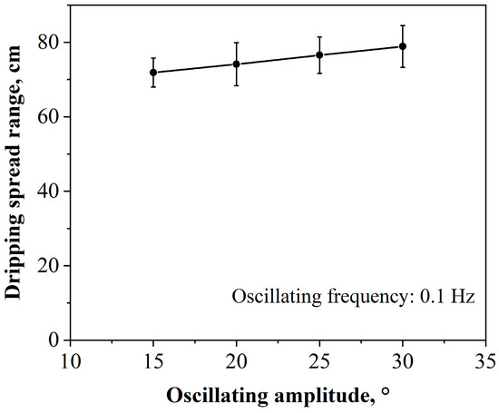 Table 5 summarizes the dripping behavior at different oscillation amplitudes. The average number of drips and the average dripping frequency are not significantly affected by amplitude. However, as shown in Figure 11, under central ignition, the dripping spread range of molten materials increases linearly with amplitude. When the frequency is constant, a greater amplitude raises the angular velocity and the tangential velocity at which droplets are ejected, resulting in a wider dripping spread range.