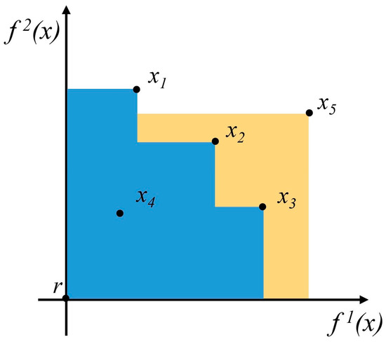 Hypervolume (HV) in blue, also called the dominated space; the Hypervolume Improvement (HVI) in yellow. f1(x) and f2(x) both represent maximized objectives, x1, x2, and x3 represent dominated solutions (Pareto optimal solutions), x4 is the non-dominated solution, x5 is the new point to evaluate, and r is the reference point.