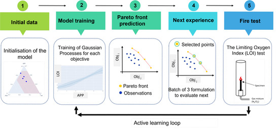 In recent years, machine learning has increasingly played a crucial role in materials formulation. Specifically, by leveraging its capabilities to analyze extensive datasets, discern patterns, and tackle complex prediction tasks, machine learning has become a valuable asset in developing new flame-retardant materials [2]. However, much of the literature on machine learning for flame-retardant materials focuses on prediction techniques rather than optimization methodologies [3,4,5]. This represents a critical gap, as optimization-driven approaches can significantly accelerate materials discovery by intelligently guiding experimental design.