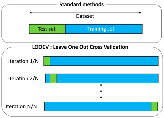 Training procedure: Standard train–test split approaches vs. LOOCV. LOOCV maximizes data utilization by iteratively using each data point as validation while training on the remainder.