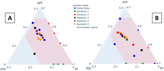 Figure 4 shows initial formulations used in both approaches. The initial formulations for literature-based data (Figure 4A) were obtained from published studies [16]. For the SFD approach (Figure 4B), initial points were generated by maximizing distances in the ternary composition space. The SFD approach achieves more uniform coverage across the design space, which is expected to provide more consistent model predictions across all regions.
