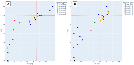Trade-off plot: (A) literature-based data points; (B) Space-Filling Design approach. The red dashed line indicates the threshold for optimal formulation selection (LOI ≥ 25 vol.%, FR content ≤ 27 wt.%). Pareto-optimal points are shown in darker colors.