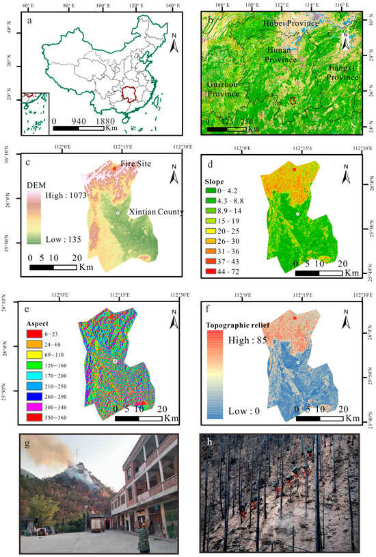 Geographical context of the study area for the 2022 “10·17” forest fire in Xintian County, Hunan Province, China. (a) Location, (b) vegetation type distribution, (c) digital elevation model (DEM), (d) slope, (e) aspect, (f) topographic relief, and (g,h) fire scene map.