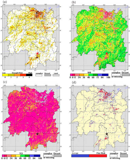 Integrated assessment of the causative environment for the eruptive fire based on multi-source indices. (a) Drought Risk, (b) VHI, (c) TCI, (d) Fire Risk. VHI and TCI values range from 0 (extreme stress) to 100 (optimal condition), with values below 40 indicating drought stress and values below 15 signifying extreme thermal/drought conditions.