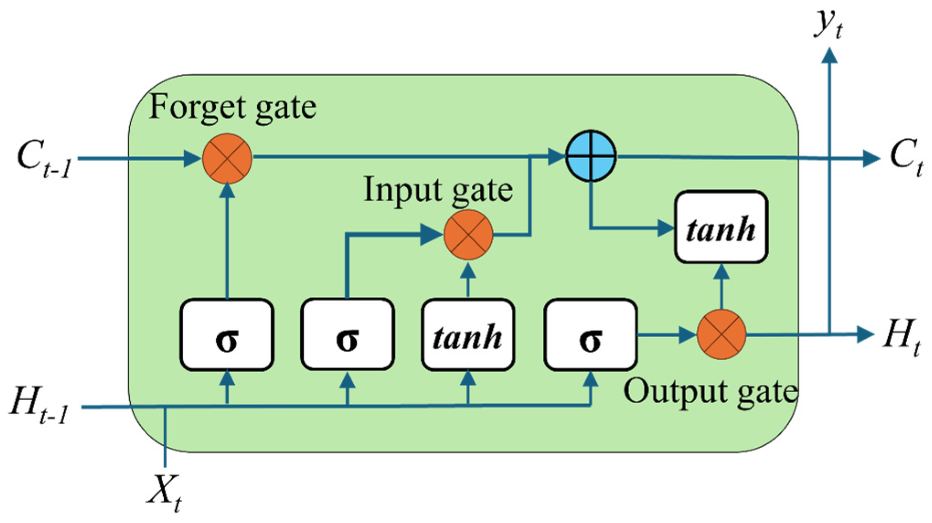 ot-are responsible for controlling data flow and determining how the memory cell updates at each timestep. Because the gates control information flow, each uses a Sigmoid activation to map its pre-activation to [0, 1]. The input gate regulates how much of the candidate cell content is written to the memory; the forget gate determines how much of the previous cell state is retained; the output gate controls how much of the updated cell state is exposed in the hidden state. Concretely, at the forget gate, the current input and the previous hidden state are concatenated and passed through a sigmoid,