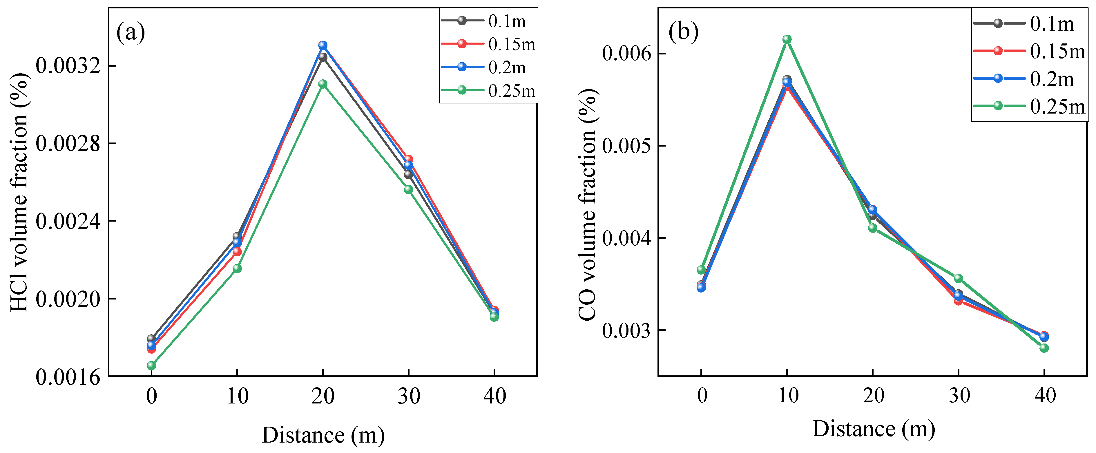 A total of five sets of gas concentration sensors were deployed. Each set was capable of simultaneously measuring the volume fractions of CO and HCl. These sensors were located at 5 m upstream of the fire source, at the fire source, 5 m downstream of the fire source, 35 m downstream of the fire source, and at the end of the return airway. The arrangement of the gas concentration sensors is depicted in
