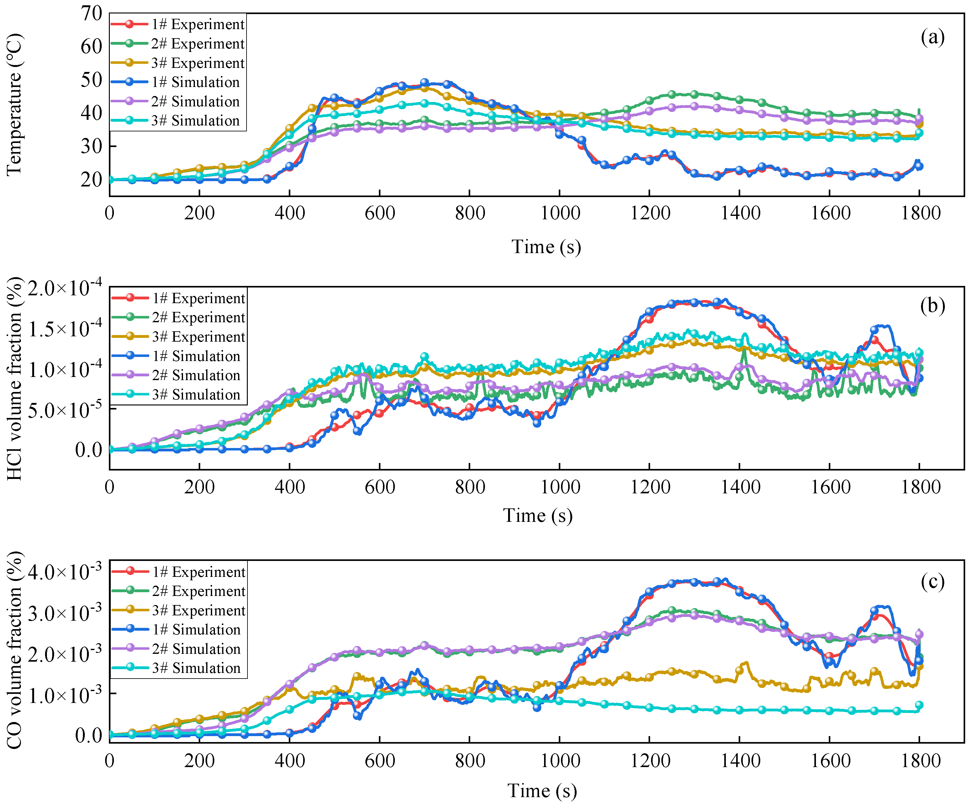 To validate the accuracy of the fire simulation results, temperature and HCl concentration changes at monitoring points 1#, 2#, and 3# under a wind speed of 1.0 m/s were selected for verification. The experimental and simulated values were compared and analyzed.