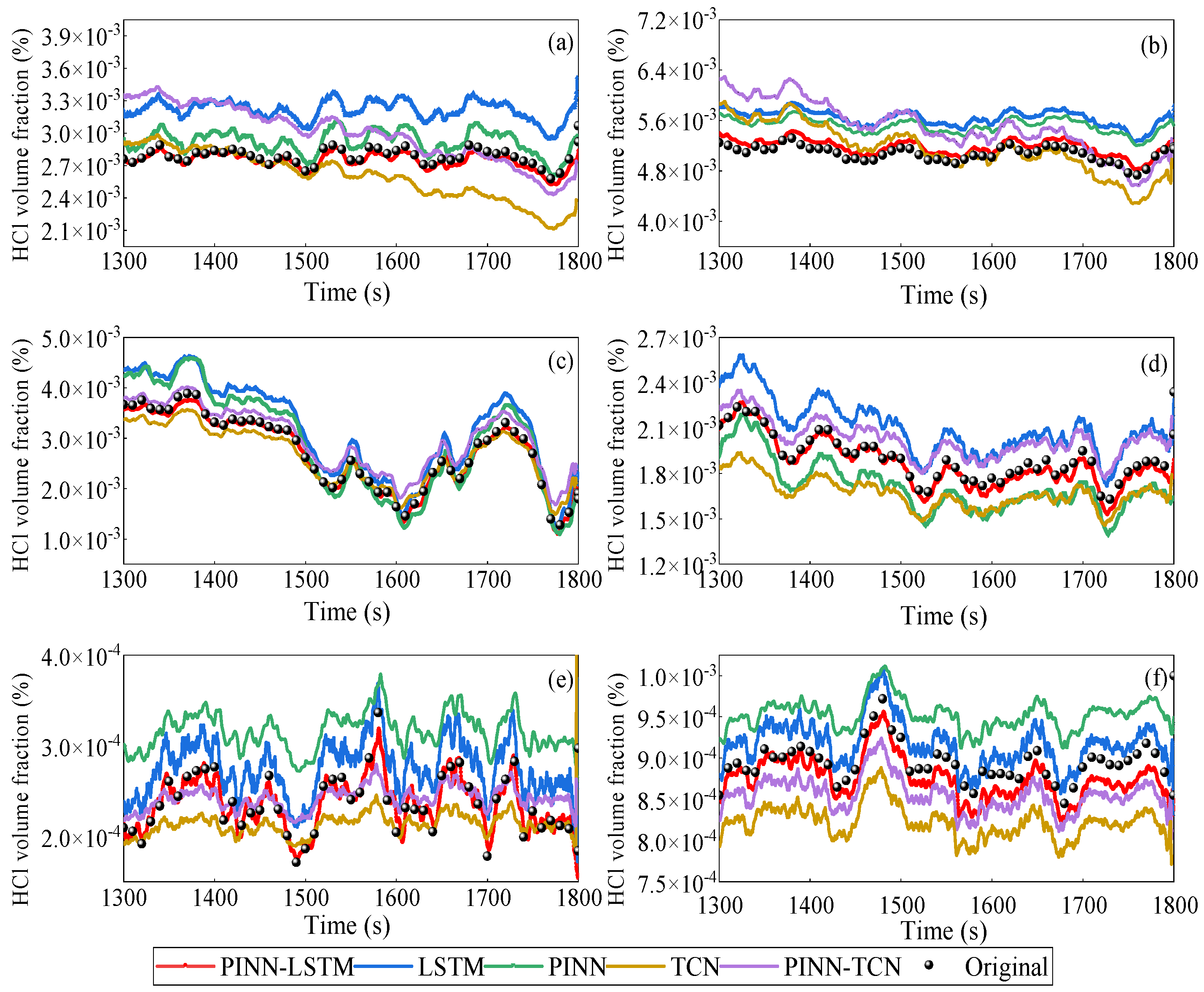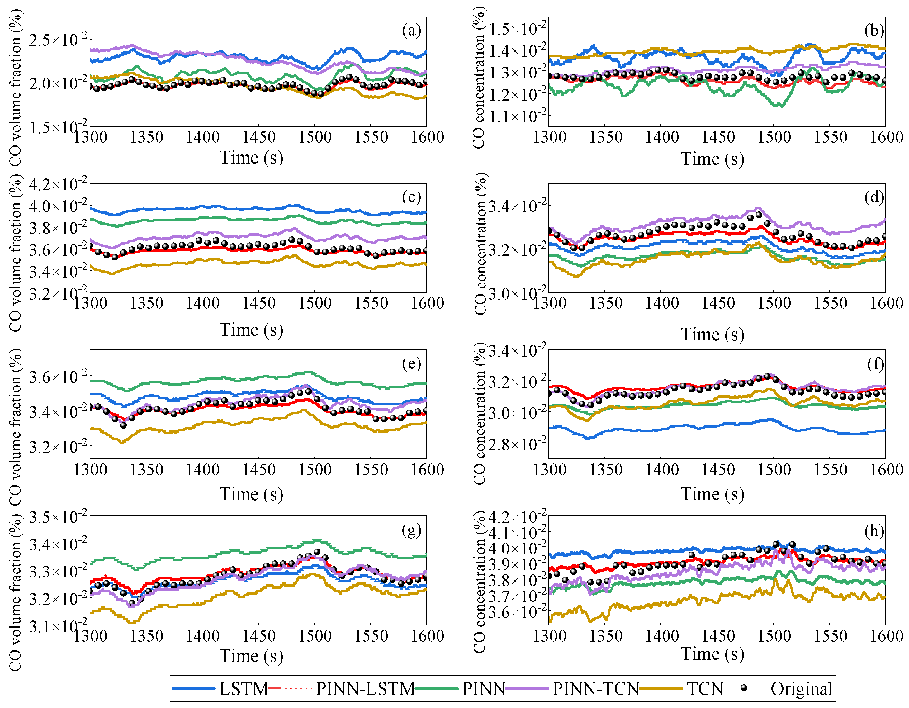 Compared with PINN-TCN, the PINN-LSTM model exhibited slightly better accuracy and smoother temporal prediction profiles, with average MSE and RMSE values 8–12% lower across all distances. This advantage is attributed to the LSTM’s inherent ability to retain long-term sequential dependencies, allowing it to more effectively capture the gradual evolution of CO and HCl concentrations over time. Nevertheless, PINN-TCN also demonstrated strong stability and computational efficiency, verifying that the incorporation of physical constraints plays a more decisive role in improving model performance than the specific temporal network architecture.