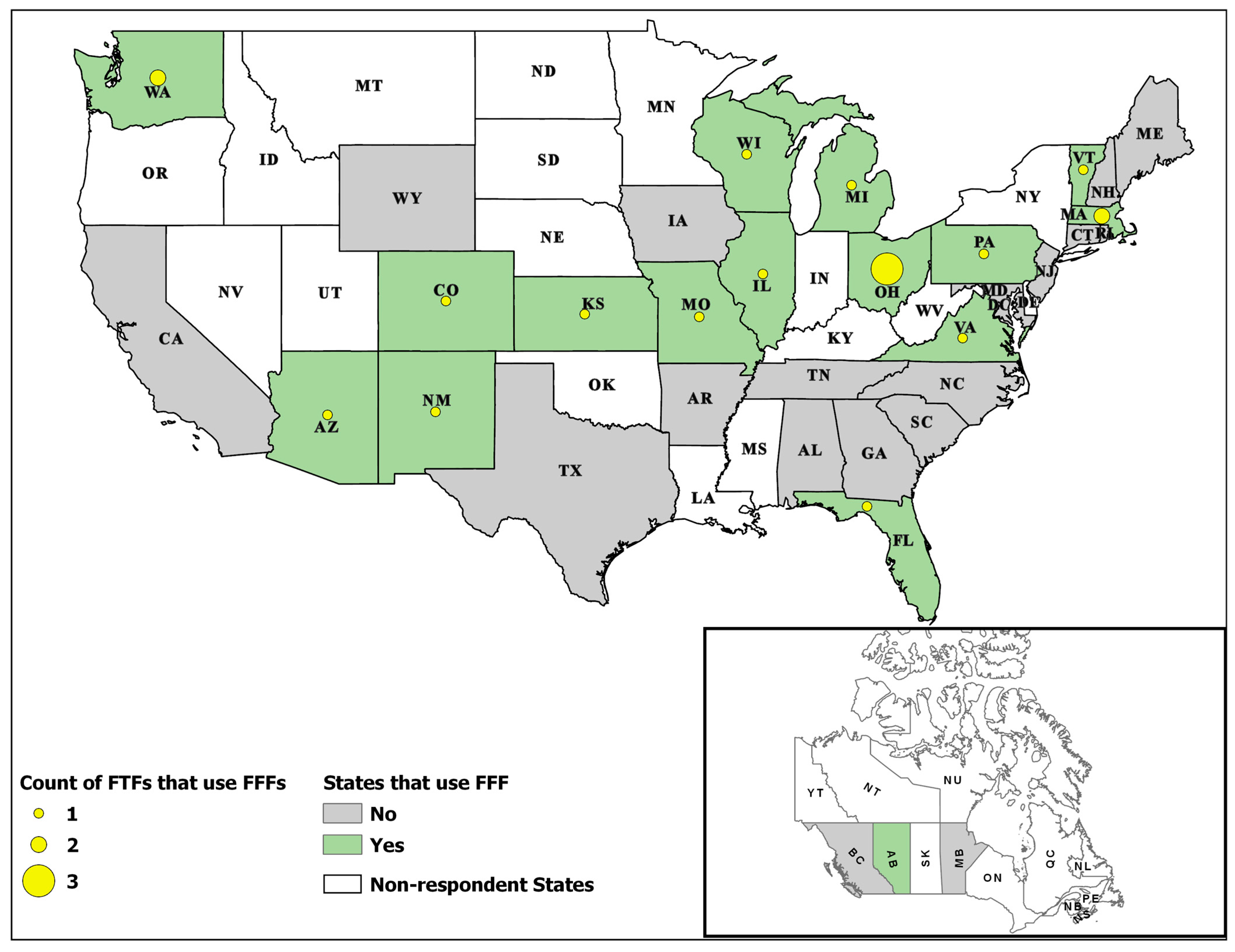 Of all Class B foam users, 38% (n = 21) used FFFs at the time of the survey. These were located in 15 different US states and one Canadian province (Figure 1). Ohio had the highest number of responding FTFs that used FFFs (n = 3), followed by Massachusetts and Washington State (n = 2), while the rest of the states had one of the participating FTFs using FFFs. As shown in Table 2, FFF adoption varied across facility types. Metropolitan and municipal FTFs had the highest adoption rate (54.5%), followed by state facilities (38.5%). Multiple-type and other facilities had lower adoption rates (30% and 9.1%, respectively). These differences likely reflect variability in institutional capacity and regulatory oversight. Larger, state-funded, or municipal facilities are more likely to receive technical guidance and funding support for PFAS-free transitions, whereas smaller and private facilities have limited budgets, a lack of training resources, and the absence of state mandates.