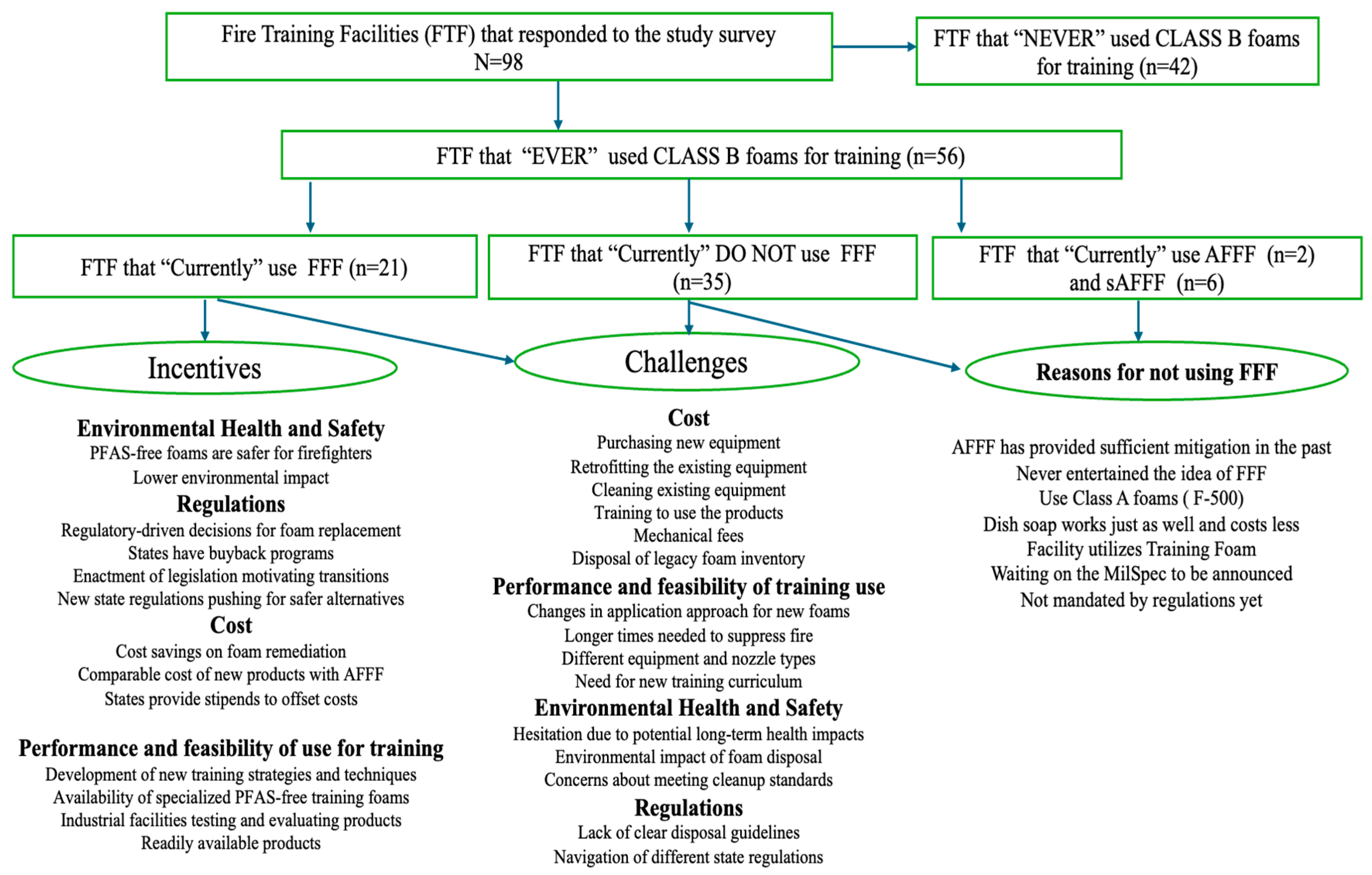 Our work aims to address knowledge gaps related to the implementation of FFF alternatives in fire training facilities (FTFs). We focused on FTFs due to their historical use of AFFFs for training exercises and PFAS environmental contamination near training sites. FTFs are also important to study, given that firefighter instructors are a higher-risk group due to the high frequency and duration of exposure to PFASs during training practices. Our objective was to determine the status of AFFF and FFF use in fire training facilities and identify the incentives and challenges associated with the implementation of FFFs at FTFs.