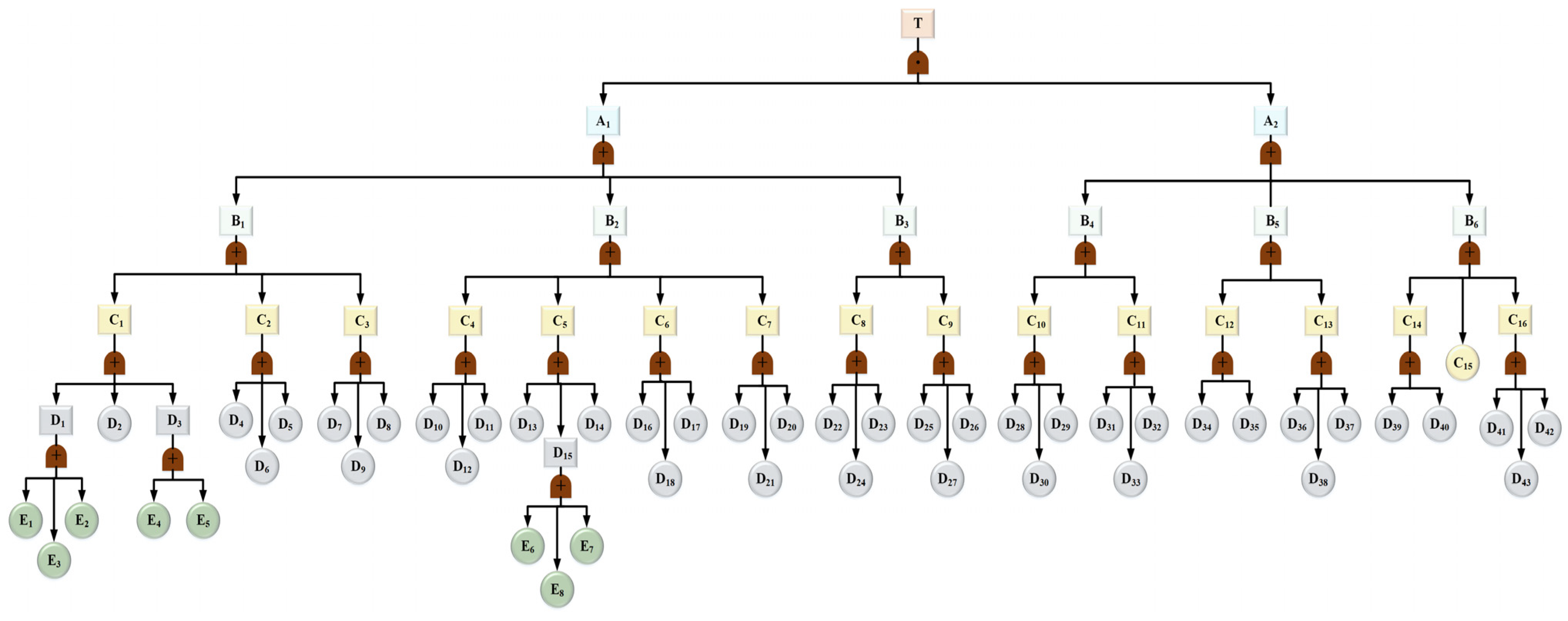 The FT was a system reliability and risk analysis method grounded in deductive reasoning. By establishing logical causal relationships, it retroactively traced all potential contributing events from the “top event”—the incident that could lead to system failure. This model was widely employed in risk early warning and mitigation across diverse industries. Its core components fell into four categories: top events, intermediate events, basic events, and logic gates.