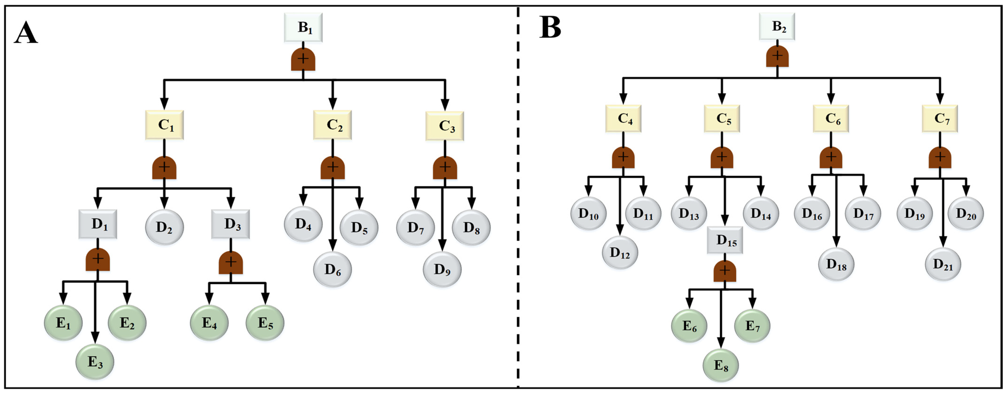 Figure 3. Fault tree model concerning battery quality and maritime transportation: (A)—battery quality; (B)—maritime transportation.