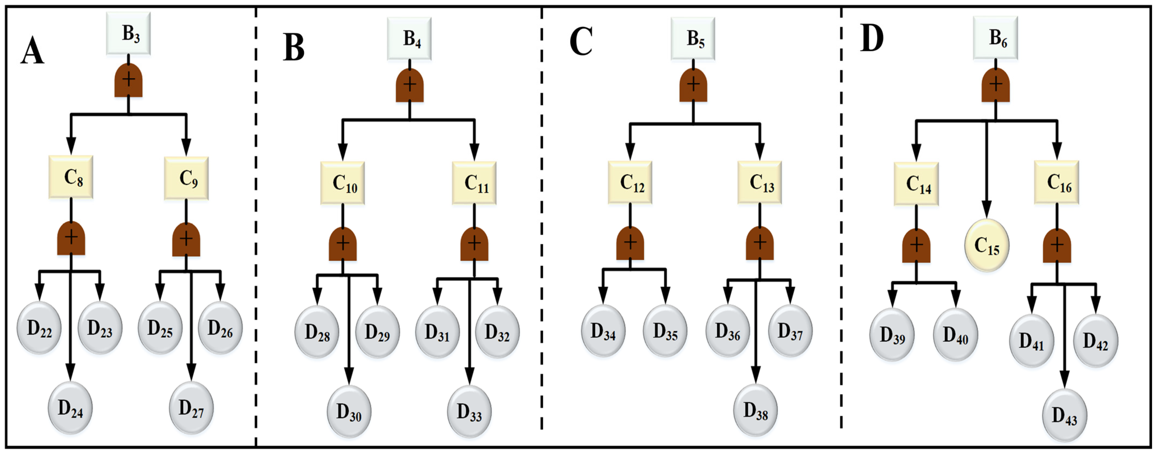 Figure 4. Fault tree model concerning shipping container protection systems and pre-fire emergency response measures: (A)—shipping container protection systems; (B)—early detection and warning; (C)—fire suppression systems; (D)—emergency rescue.