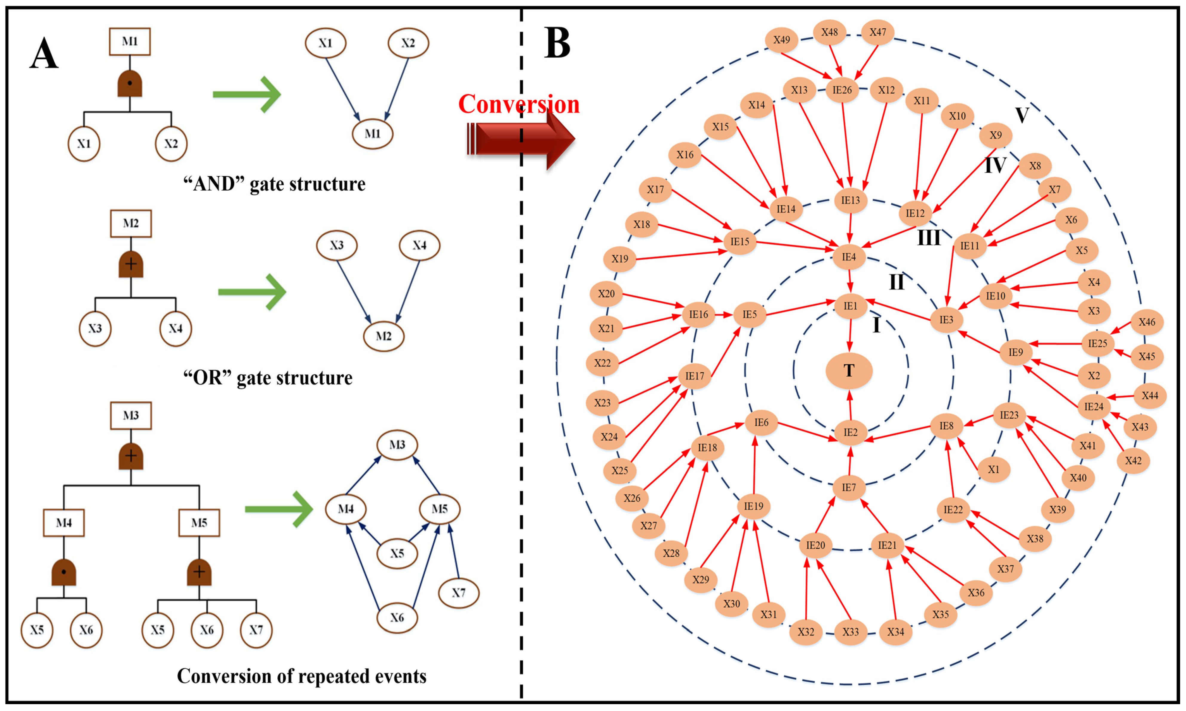In 1988, Judea Pearl proposed the Bayesian Network model, building on a synthesis of prior research. As a probabilistic graphical model, its core consisted of a directed acyclic graph, which was theoretically based on the integration of probability theory and graph theory. It characterized uncertainties within a system through probability distributions. Not only did this model exhibit robust probabilistic reasoning capabilities, but it also clearly revealed causal relationships between variables; meanwhile, it could more accurately calculate system failure probability and the posterior probabilities of basic variables by utilizing the belief propagation algorithm and evidence update mechanism. Moreover, the construction of BN was often based on FT, and the specific conversion schemes for this process would be elaborated in subsequent applications.
