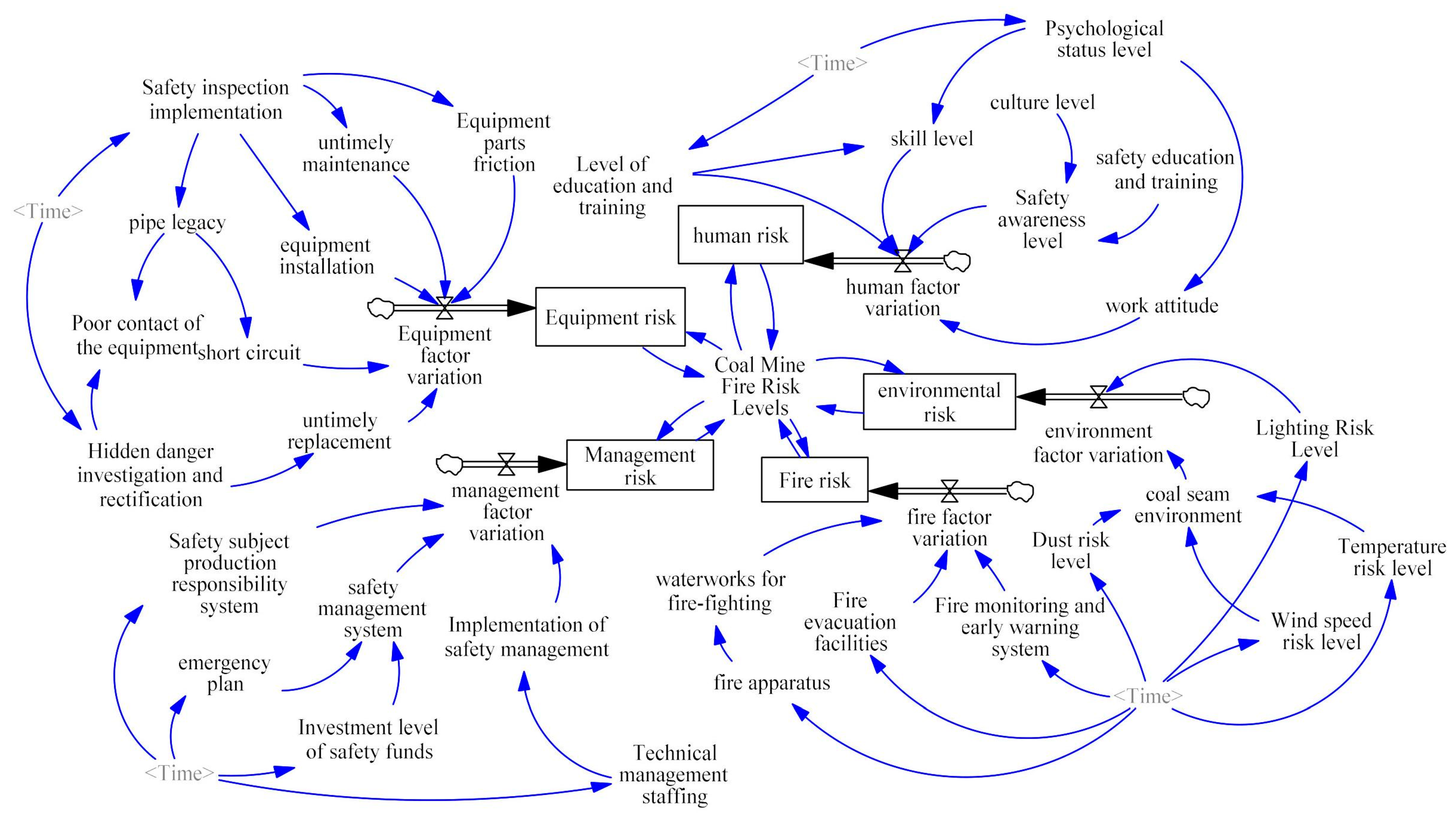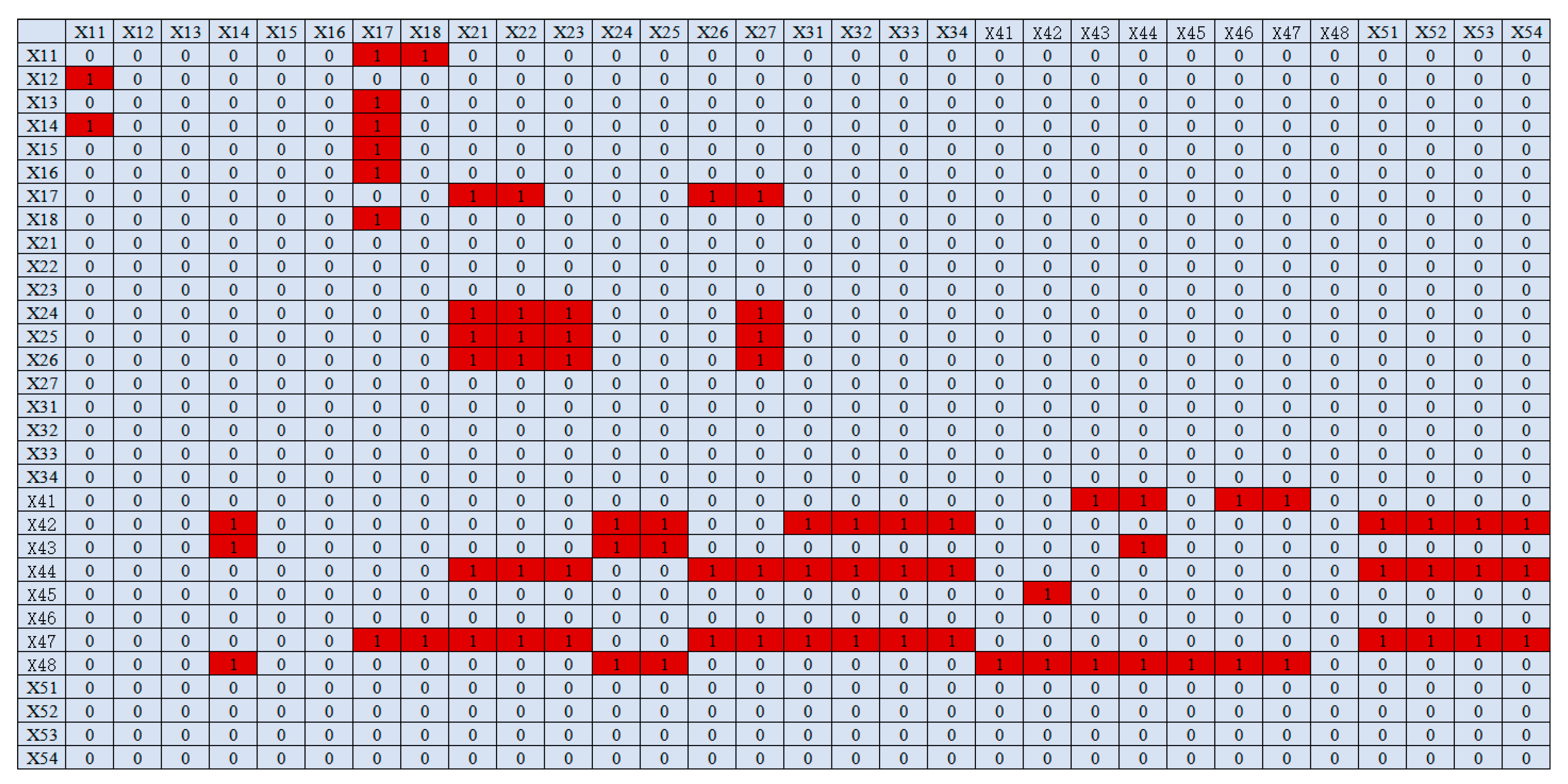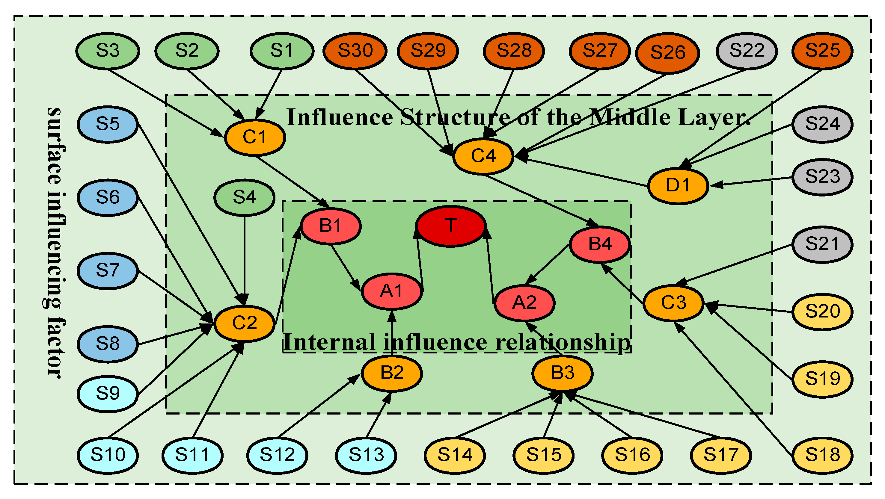 | Level 1 (Top floor) | Short circuit X21, Poor contact X22, Pipeline aging X23, Component friction X27, Underground temperature X-1, Underground coal dust concentration X32, Underground lighting X33, Underground wind speed X34, Mine emergency plan X46, Underground fire Fighting equipment X51, Underground fire water supply system X52, Underground fire monitoring and warning system X53, Underground personnel evacuation facilities X54 |