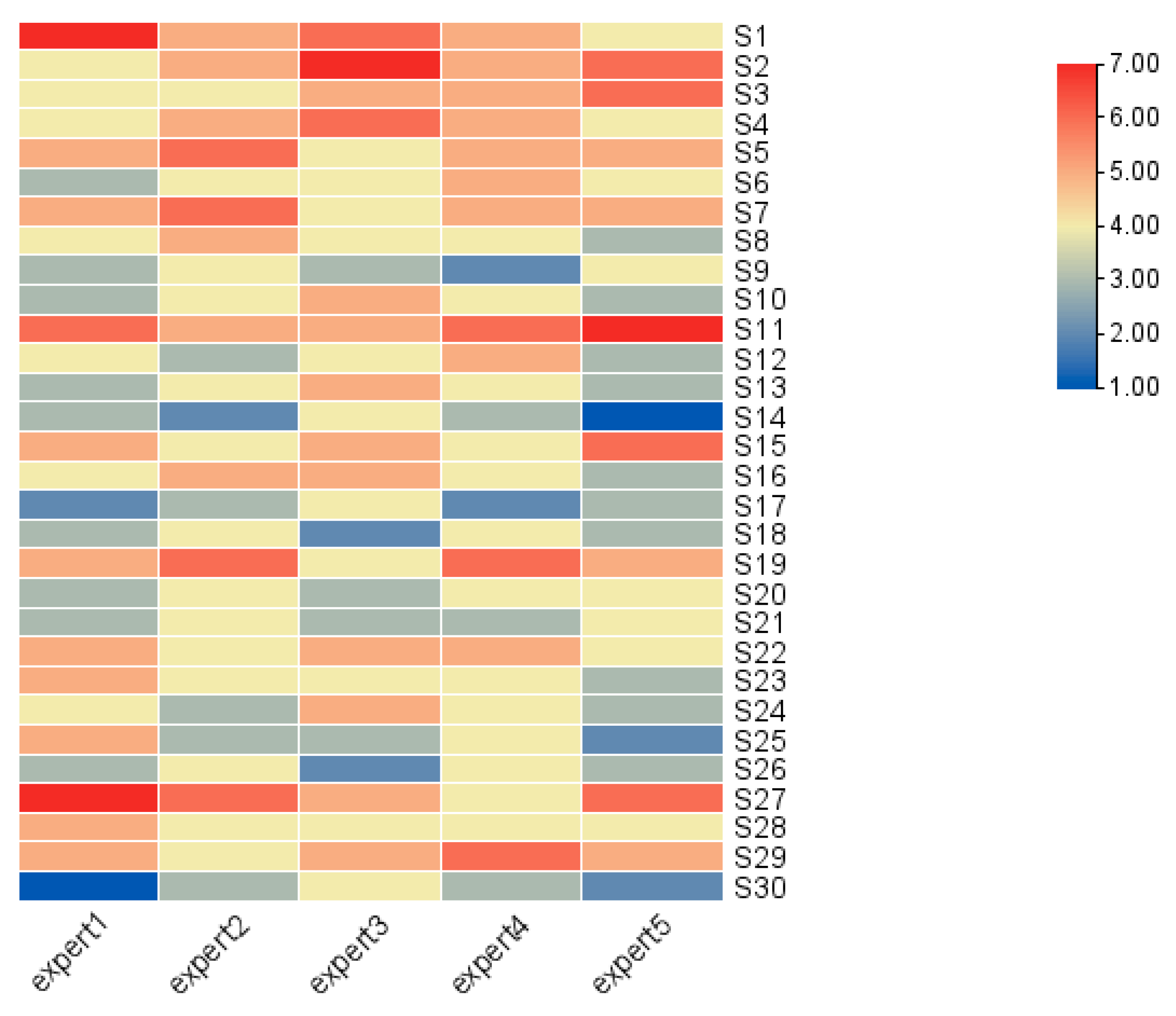 | S30 | (0.0,0.0,0.1) | (0.1,0.3,0.5) | (0.3,0.5,0.7) | (0.1,0.3,0.5) | (0.0,0.1,0.3) |