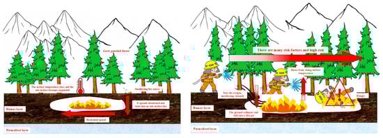 Fire as an important ecological factor in the ecosystem, exerts fundamental regulatory control over forest succession dynamics, landscape configuration, and energy-matter fluxes within the ecosystem []. Forests play a significant role in the global carbon cycle, absorbing 33% of anthropogenic emissions, thus constituting a key factor in mitigating climate change []. However, recent anthropogenic land-use changes and climate change impacts have significantly increased the frequency and severity of global wildfire incidents [,]. For instance, about 15 million hectares of land were burned in Canada in 2023—exceeding historical averages by sevenfold []. When large-scale forest fires occur, they not only cause vegetation loss and ecosystem degradation but also create complex and hazardous fire environments that endanger firefighting personnel [,]. Therefore, the safety of firefighters has always been a matter of great concern for both wildfire management agencies and the scientific community. Forest fire combustion manifests in two distinct models: flaming and smoldering, both of which are present in most forest fires [,]. However, traditional forest fire research has focused more on flaming fires, often neglecting smoldering dynamics [], which may lead to a “false suppression” phenomenon, where a flaming fire is extinguished, while sub-surface smoldering in humus or peat layers continues to spread and may turn back into a flaming fire after a long distance or time [,]. The sub-surface fire smoldering process can sustain prolonged high temperatures of 400–700 °C, leading to surface suspension, and the release of toxic gases such as CO and SO2 [,]. Sudden ground collapse, sub-surface high temperatures, and the simultaneous release of large amounts of toxic gases, greatly increase the complexity of the fire scene and pose a serious challenge to the safety of firefighters [,]. Therefore, it is particularly important to actively research the key risk factors involved in sub-surface fire suppression (see Figure 1 for a schematic diagram of forest sub-surface fires suppression risks).