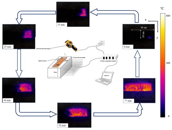 During the simulated ignition experiment, real-time monitoring and data recording were performed using a FLUKE Ti400(manufactured by Fluke Corporation, USA) infrared thermal imager. The thermal imaging camera was mounted above the smoldering reactor to ensure complete coverage of the sub-surface fire combustion zone, enabling continuous monitoring of surface temperature variations induced by sub-surface smoldering. Simultaneously, the system recorded the dynamic process of lateral collapse of the surface, with all sequential images and data being systematically archived. In parallel, K-type thermocouples coupled with the data acquisition module were employed to record the temperature changes during the smoldering process of the sub-surface fire. This dual monitoring approach effectively captured both surface and sub-surface thermal characteristics and their evolving trends throughout the smoldering process (Figure 3).