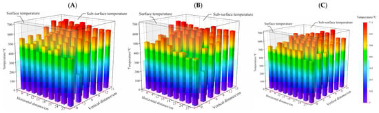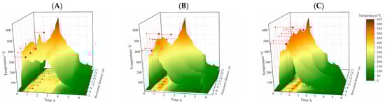 At 3.56% humus moisture content (Figure 4A), the peak surface temperature ranged from 453.41 °C to 551.96 °C, with localized maxima reaching 551.96 °C at 3 cm horizontal distance and 520.76 °C at 9 cm. When the moisture content of humus increased to 5.37% (Figure 4B), the surface temperatures exhibited a range (447.67–584.81 °C) with concentrated high-temperature zones, particularly peaking at 584.81 °C within the 3–15 cm horizontal range. The peak temperature was comparatively lower within the range of 18–27 cm, but it remained above 447.67 °C. The 13.56% moisture condition (Figure 4C) demonstrated superior thermal stability and intensity (468.15–600.24 °C). Compared to lower moisture contents, this condition produced both higher and more stable peak temperatures. At a horizontal distance of 9 cm, the peak surface temperature reached its maximum (600.24 °C), and at distances of 3 cm, 6 cm, 12 cm, 15 cm, 18 cm, and 21 cm, the peak temperature maintained above 504.22 °C. As the sub-surface fires propagated downward, the smoldering entered a stable state accompanied by heat accumulation, forming a distinct sub-surface thermal environment characterized by a persistent peak temperature gradient ranging from 277.53 °C to 710.70 °C. When overhanging structures formed at the surface layer and subsequently collapsed, the momentary exposure of the sub-surface heat reservoir generated instantaneous thermal shock, creating secondary hazard potential that significantly compromises firefighter safety during suppression operations.