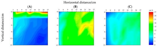 When the humus moisture content was 13.56%, the initial spread rate was relatively low, indicating the inhibitory effect of moisture content on early fire development. However, as the sub-surface fires progressed, the spread rate increased significantly within a vertical distance of 3–15 cm. At a horizontal distance of 9–16 cm, the deep-layer propagation rates substantially exceeded those at the surface level. In addition, the most rapid spread was concentrated in the area spanning 18–27 cm horizontally and 1–8 cm vertically, with the fastest spread rate reached at 11.64 cm/h (Figure 5C).