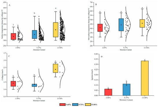Characteristics of changes in sub-surface fires risk factors under different moisture content conditions. The influence of moisture content on (A) Surface temperature during the collapse; (B) Sub-surface temperature during the collapse; (C) Collapse time; (D) Ignition time. Note: The presence of any identical lowercase letters indicates no significant difference.