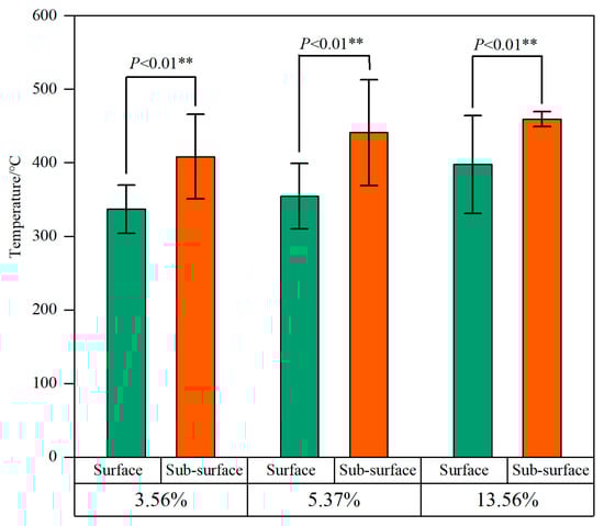 With moisture content increased, both sub-surface and surface temperatures at collapse exhibited a rising trend. The highest temperatures were recorded at 13.56% moisture content, with the sub-surface and surface temperatures at collapse reaching 459.17 °C and 397.73 °C, respectively (Figure 8). Notably, sub-surface temperatures during collapse were consistently and significantly higher than corresponding surface temperatures across all moisture levels (p < 0.01). This thermal pattern indicates that during the spread of the sub-surface fire, the heat energy was mainly concentrated within the humus layer, resulting in substantially elevated sub-surface temperatures. The observed temperature gradient between sub-surface and surface layers represents a critical characteristic of sub-surface fire behavior, serving as a key indicator for assessing the fire intensity and evaluating the sub-surface fire risks.