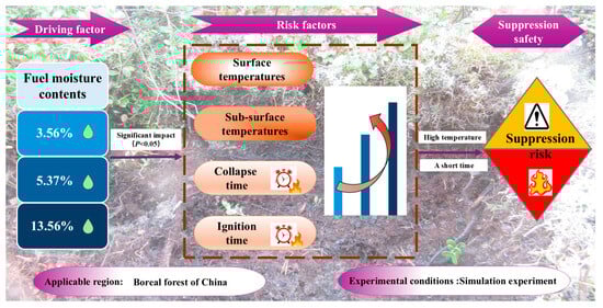 Forest sub-surface fires represent a challenging combustion phenomenon to control, and the process of smoldering is often overlooked in wildfire incidents. Traditional forest fire research has prioritized flaming combustion over smoldering dynamics, despite its critical risk factors including sustained high temperature and ground surface collapse that significantly endanger firefighter safety. This study focuses on The Daxing’an Mountains, a prime sub-surface fire-prone region in China, employing field investigations and controlled smoldering experiments to quantify the key risk factors for sub-surface fires suppression while elucidating moisture content’s regulatory effects. The results demonstrate that sub-surface smoldering fires maintain elevated temperatures with the surface peak temperature reaching 600.24 °C and sub-surface peak temperature up to 710.70 °C. The spread rate is relatively slow (maximum 27.00 cm/h), yet exhibits pronounced fluctuations along the vertical profile, creating a critical predisposition to overhanging collapse. The moisture content has extremely significant effects (p < 0.01) on key risk factors including surface temperature, sub-surface temperature, collapse time and ignition duration. Lower moisture content prompted earlier surface collapses, whereas higher moisture content displays delayed collapse but resulted in dangerously elevated temperatures at collapse points, presenting extreme suppression risks.