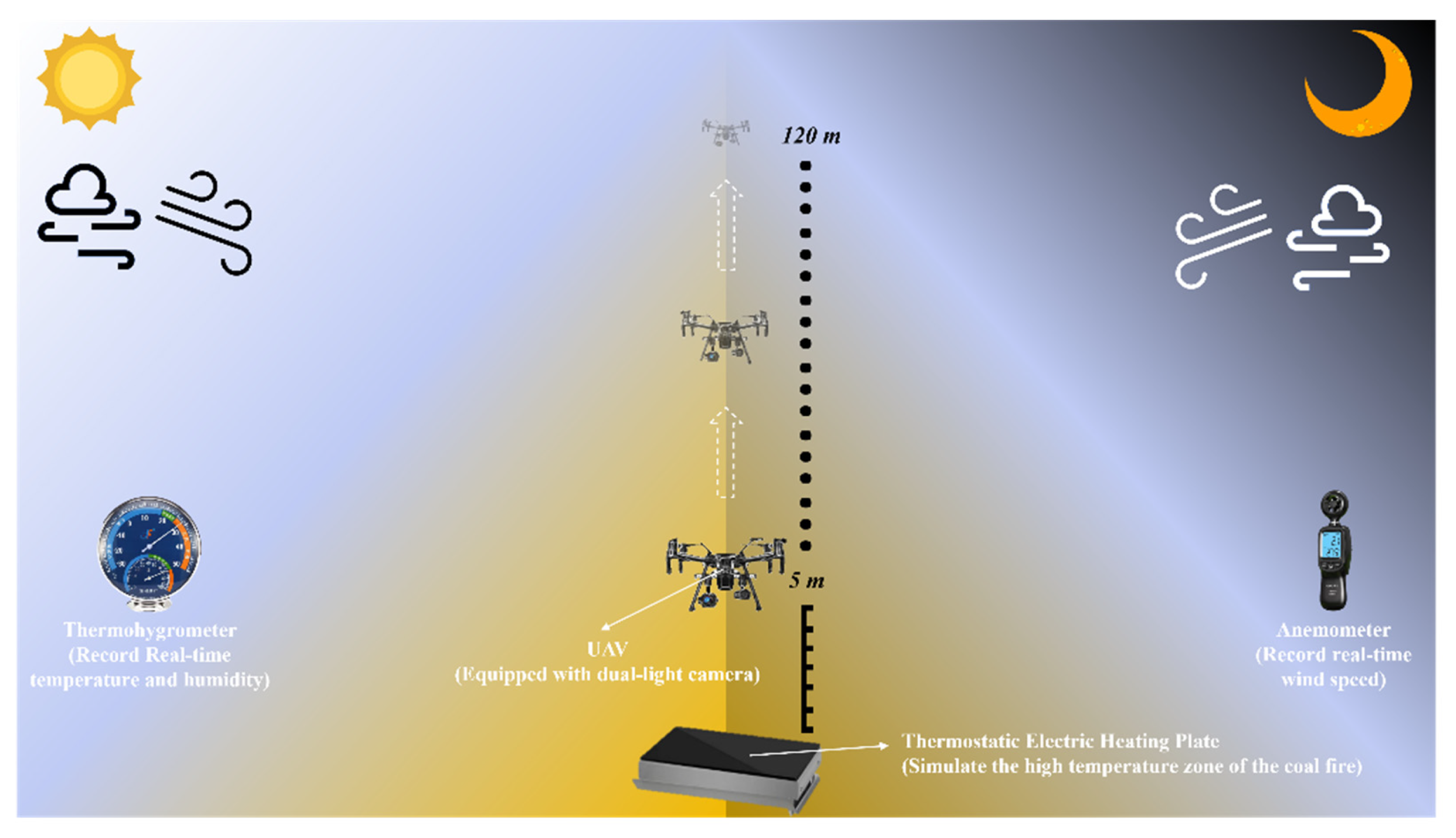 This study utilizes the DJI Matrice 210 RTK V2 (DJI, Shenzhen, China) quadcopter, equipped with the DJI Zenmuse XT2 (DJI, Shenzhen, China) dual-camera system. The infrared imaging module features a FLIR Tau 2 thermal sensor (640 × 512 pixels, temperature range: −40 °C to 550 °C), while the visible-light module contains a 12-megapixel optical sensor. The experimental monitoring target is an infrared microcrystalline constant-temperature electric heating plate (400 × 600 mm) capable of maintaining a uniform surface temperature. Its temperature is precisely controllable within a specified range (from ambient temperature to 600 °C), with an accuracy of ±1 °C, enabling the simulation of realistic coal fire conditions. To further ensure data quality, the heating plate was allowed to stabilize for at least 20 min at each target temperature before data acquisition commenced. Additionally, spot checks were periodically performed using a calibrated K-type thermocouple (with an accuracy of ±0.5 °C) to verify the surface temperature readings, which consistently confirmed the stability and accuracy of the heating plate.