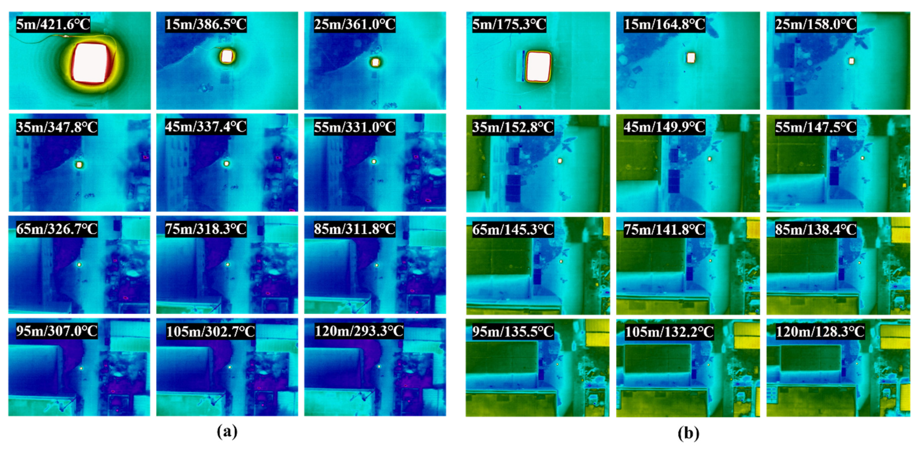 Figure 2. Examples of TIR image sequences acquired from experiments. (a) Partial TIR images at 468.6 °C from 5 to 120 m altitude. (b) Partial TIR images at 200.6 °C from 5 to 120 m altitude.