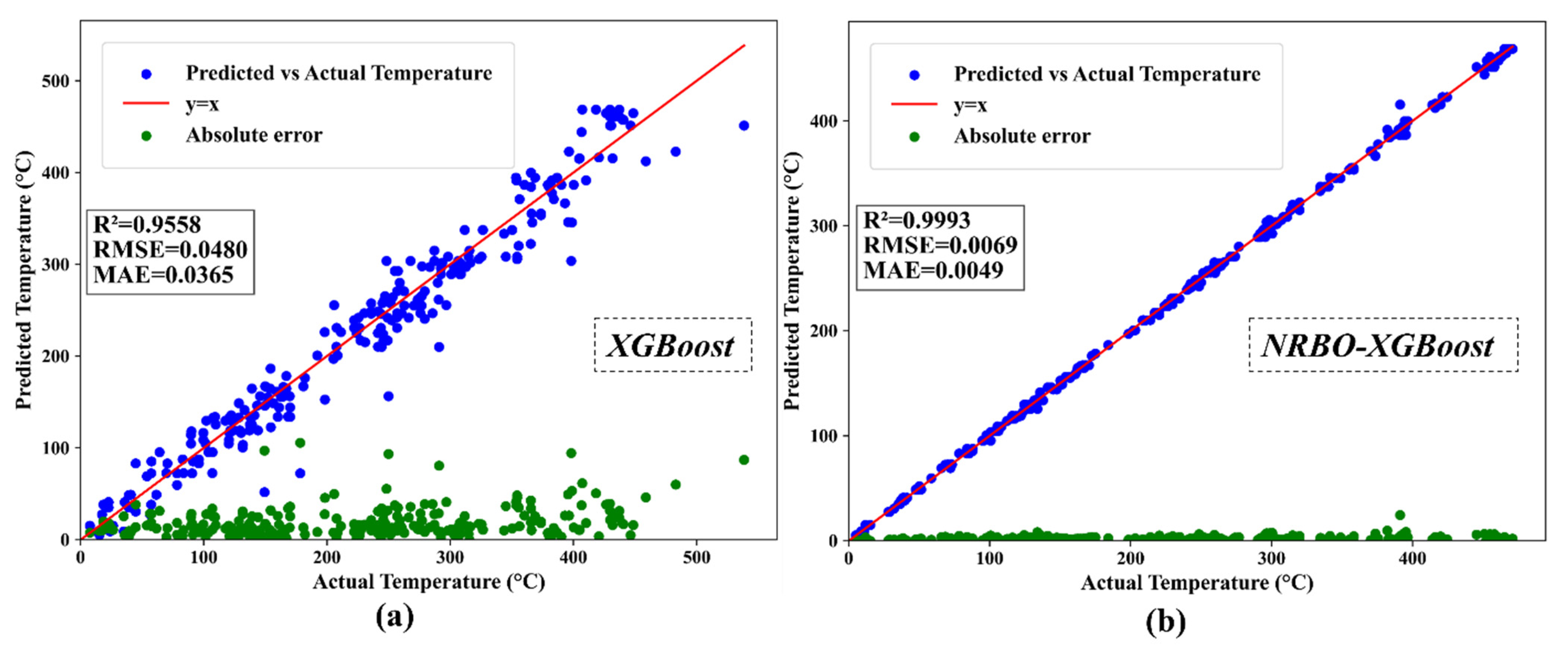 Figure 8. Overview of regression results before and after XGBoost optimization. (a) Original XGBoost model. (b) Optimized NRBO-XGBoost model.