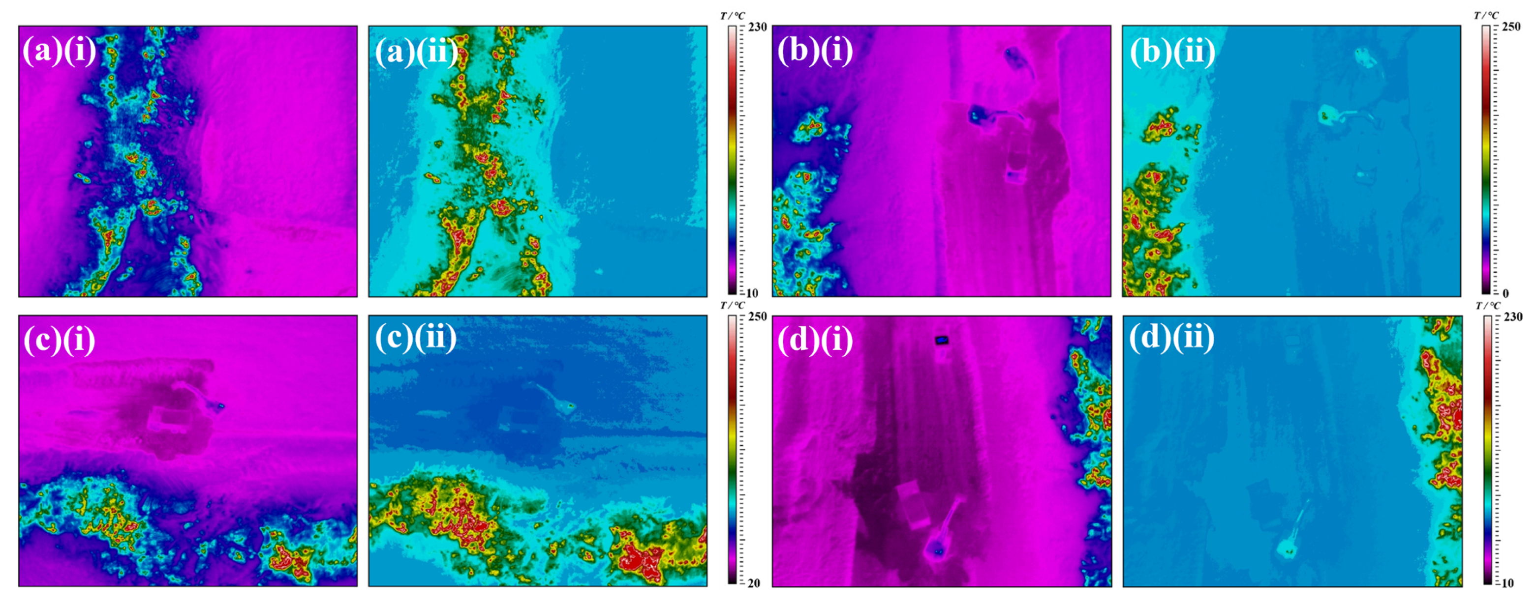 Figure 9. Comparison of TIR images before and after temperature correction. (i) Original TIR image. (ii) Temperature-corrected TIR image. (ad) Four distinct observation scenes.